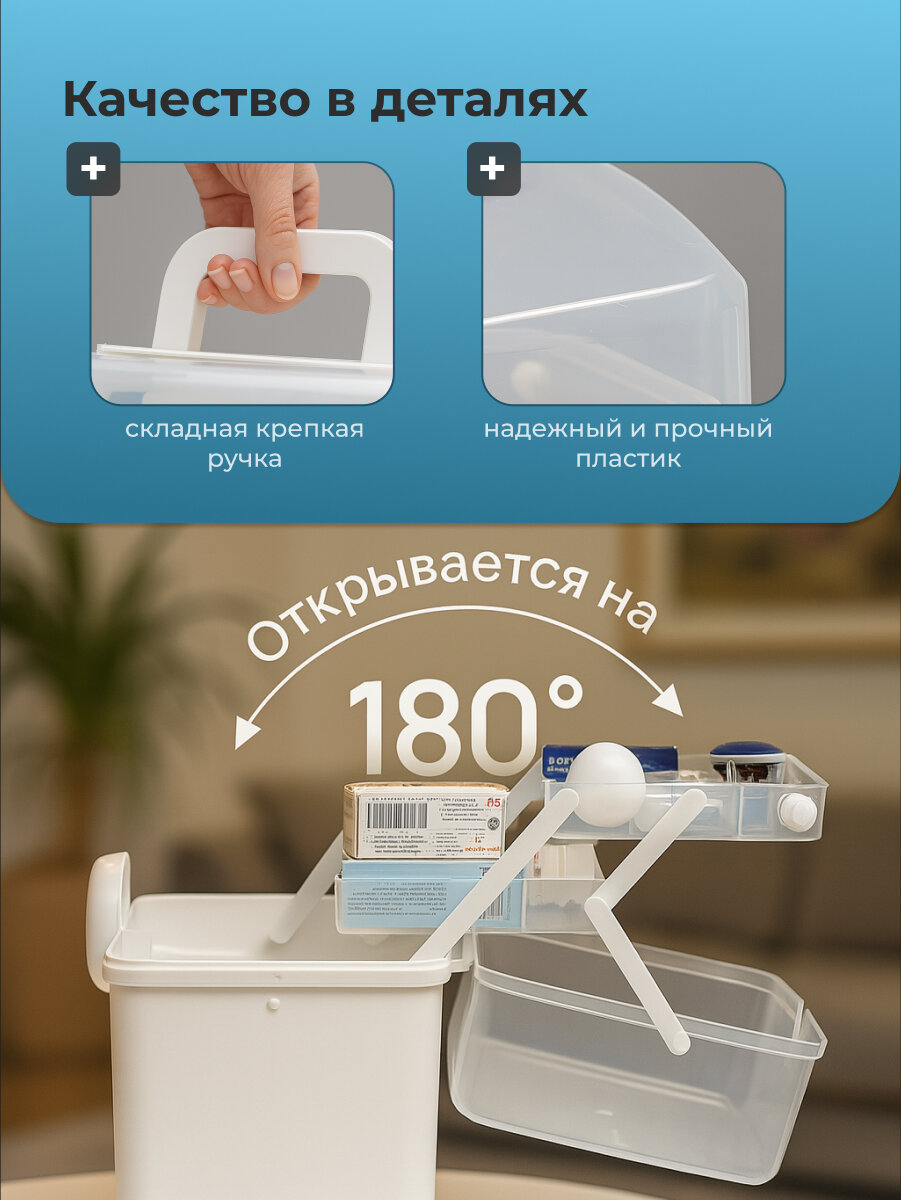 Большая домашняя аптечка — это незаменимый аксессуар для каждой заботливой семьи, который помогает поддерживать порядок и быстро находить нужные медикаменты в любой ситуации. Удобный контейнер для лекарств с отделениями позволяет систематизировать таблетки, мази и витамины по категориям, избавляя от необходимости искать нужное средство по всему дому. Эргономичная аптечка станет настоящей помощницей в повседневной жизни и обеспечит уверенность в том, что всё необходимое всегда под рукой. Прочный контейнер изготовлен из качественного материала, устойчивого к повреждениям и влаге. Просторная коробка для лекарств вместит как стандартные упаковки, так и объёмные флаконы, сохраняя при этом аккуратный внешний вид. Удобный бокс для лекарств с надёжной крышкой защитит содержимое от пыли и света, а большое количество отделений сделает хранение максимально организованным. Ящик для лекарств идеально подойдёт как для домашнего использования, так и для поездок за город. Позволит разместить всё в одном месте — от термометра до перевязочных материалов, экономя время и нервы. Функциональный контейнер станет важной частью домашнего пространства, добавив в него порядок и спокойствие. Подойдет для хранения не только медицинских препаратов, но и косметических средств или мелочей. Надёжное решение для тех, кто ценит организованность и заботу о здоровье.