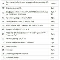 Состав: 1. Анальгин, табл. 500 мг № 10- 2 2. Ацетилсалициловая кислота, табл. 500 мг № 10- 2 3. Гипотермический (охлаждающий) пакет- 2 штуки. 4. Дротаверин (но-шпа), табл. 40 мг № 10- 1 упаковка. 5. Жгут кровоостанавливающий- 1 штука. 6. Бинт стерильный 5 м x 10 см или 5 м x 7 см- 2 штуки. 7. Бинт нестерильный 5 м x 10 см- 2 штуки. 8. Бинт нестерильный 5 м x 5 см- 2 штуки. 9. Салфетки или покрытия стерильные, не менее 6x10 см (антимикробные)- 2 10. Лейкопластырь бактерицидный 1,9 см x 7,2 см- 10 уп. 11. Салфетки или покрытия стерильные, 6x10 см (кровоостанавливающие)- 1 упаковка. 12. Бриллиантового зеленого раствор 1%, 10 мл- 1 флакон. 13. Лейкопластырь 1x250 см- 1 упаковка. 14. Бинт эластичный трубчатый медицинский нестерильный № 1, 3, 6- по 1 штука. 15. Вата нестерильная, 50 г- 2 16. Сульфацила натрия раствор 20%, 1 мл № 2 тюбик-капельница или 5 мл флакон-капельница- 1 упаковка / 1 флакон. 17. Перекиси водорода раствор 3%, 40 мл- 1 флакон. 18. Линимент синтомицина 5% или 10%, 25 г- 1 туб. 19. Нитроглицерин, капс. 0,5 мг № 20 или табл. 0,5 мг № 40- 1 упаковка. 20. Валидол, табл. 60 мг № 6 или № 10- 3 21. Устройство для проведения искусственного дыхания 'Рот-Устройство-Рот'- 1 штука. 22. Аммиака раствор 10%, 40 мл- 1 флакон. 23. Уголь активированный, табл. 250 мг № 10- 2 24. Корвалол, 15 мл- 1 флакон. 25. Ножницы- 1 штука. 26. Стаканчик для приема лекарств- 1 штука. 27. Футляр для аптечки- 1 штука.