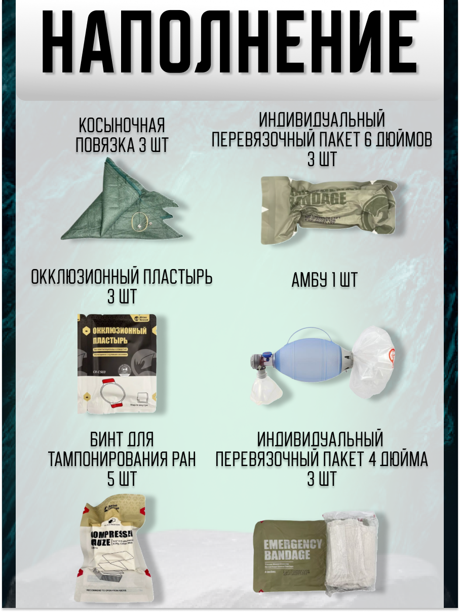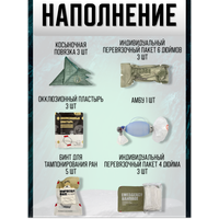В составе рюкзака также идут шины, аппарат ИВЛ, жгуты, мультитул, диагностический фонарик, бинты, окклюзивные пластыри, бандажи, термоодеяло, воздуховоды, маркеры, перчатки, противоожоговые гели и прочее оборудование.