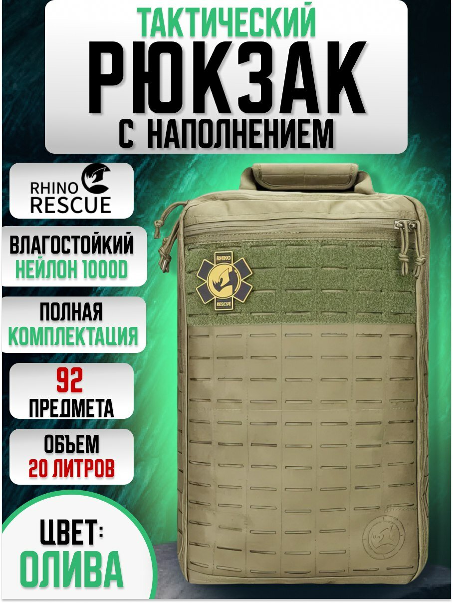 Rhino rescue рюкзак R20 с наполнением - это укомплектованная большая мужская сумка, которая предназначена для хранения тактического снаряжения, в том числе и армейской аптечки. Этот тактический ораганайзер имеет карманы и отделения, что позволяет удобно хранить и организовывать снаряжение, в частности, медицинские жгуты турникеты, бинты, шины, скотчи, ножницы и прочие принадлежности.