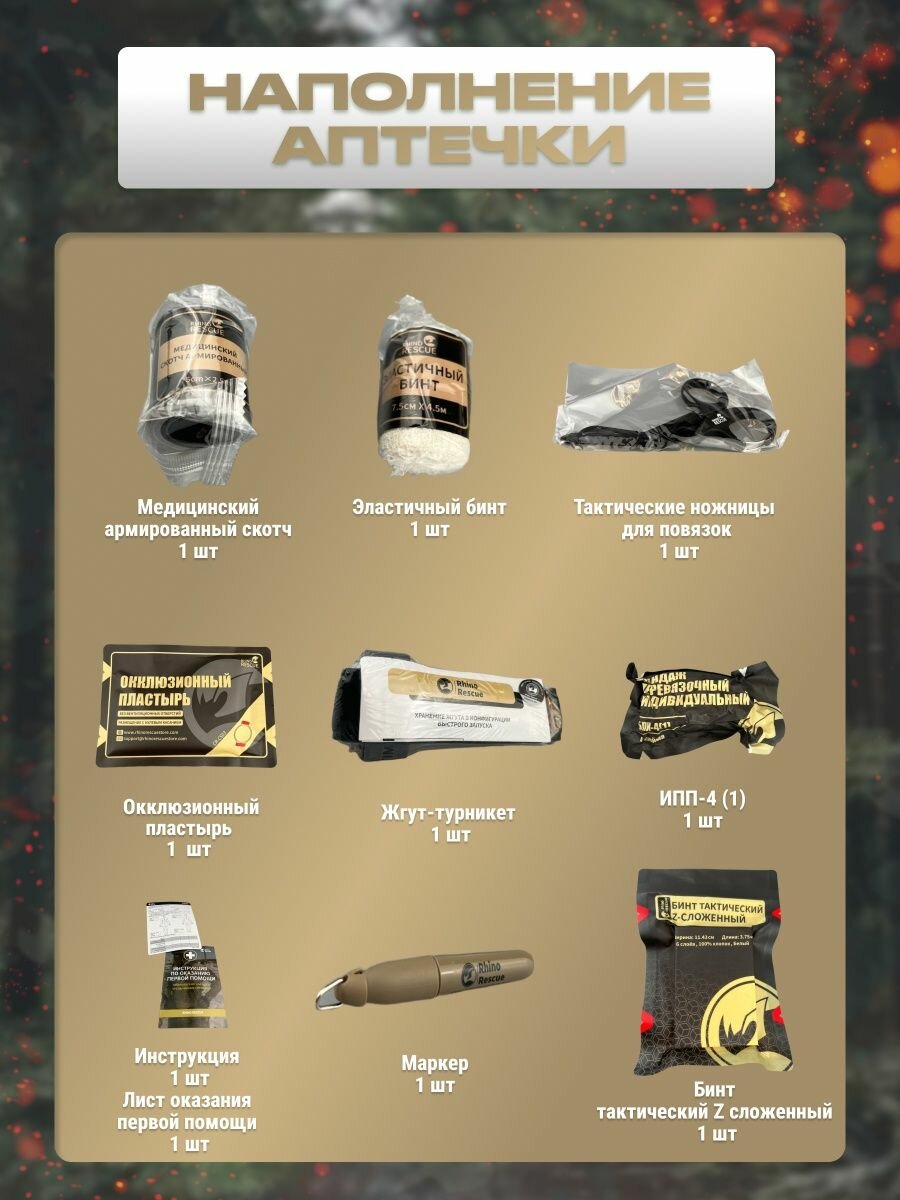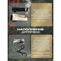Тактический набор включает в себя 10 предметов: Отрывной подсумок, жгут турникет, окклюзионный пластырь с 4 клапанами -