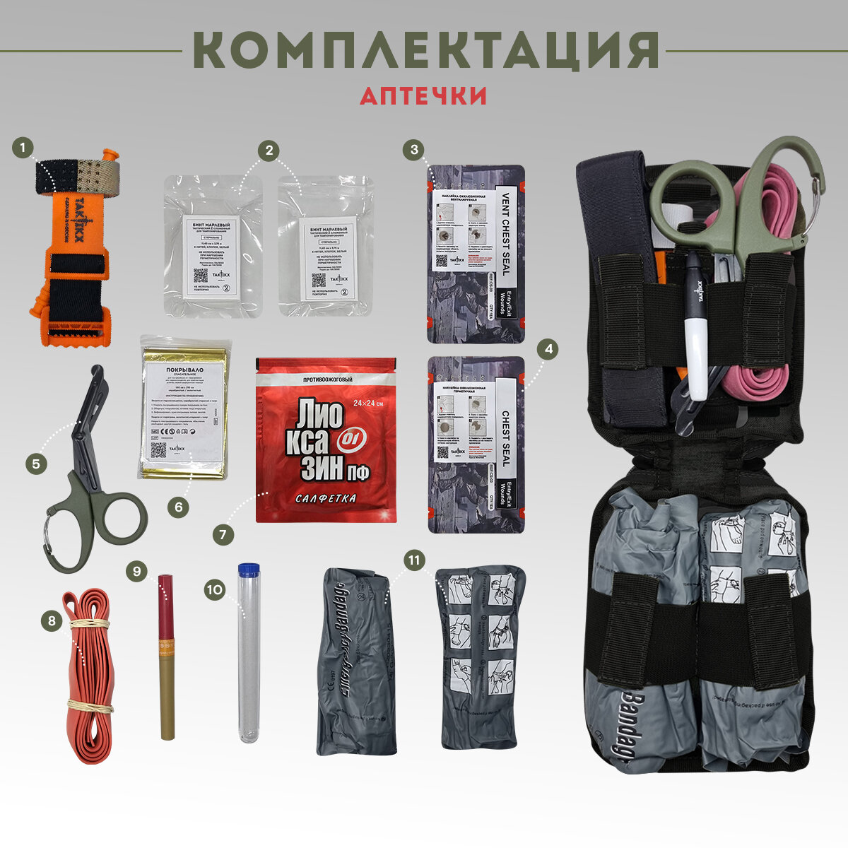 Комплектация Аптечки тактической укомплектованной от компании TAKTIKX :