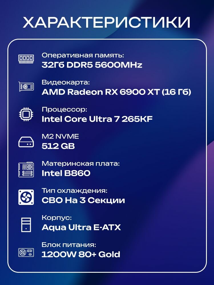 Aqua Ultra E-ATX AIO 360 чёрный, B860, Ultra 7 265KF AIO3, 512 NVME, 32 ГБ DDR5, RX 6900 XT (16 Гб), 1200W: сравнение цен, характеристики, фото, актуальное наличие и цены.
