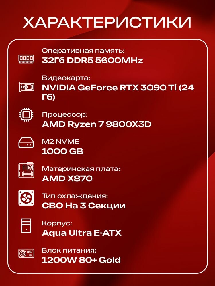 Aqua Ultra E-ATX AIO 360 чёрный, X870, R7 9800X3D AIO3, 1000 NVME, 32 ГБ DDR5, RTX 3090 Ti (24 Гб), 1200W: сравнение цен, характеристики, фото, актуальное наличие и цены.