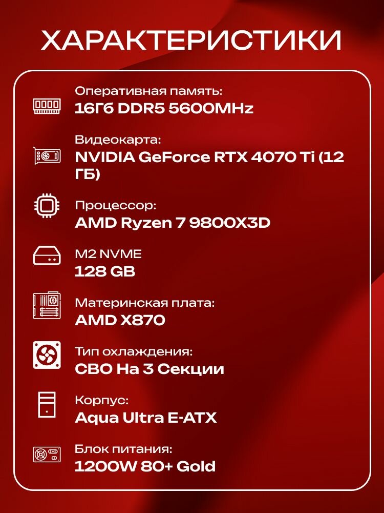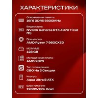 Aqua Ultra E-ATX AIO 360 чёрный, X870, R7 9800X3D AIO3, 128 NVME, 16 ГБ DDR5, RTX 4070 Ti (12 ГБ), 1200W