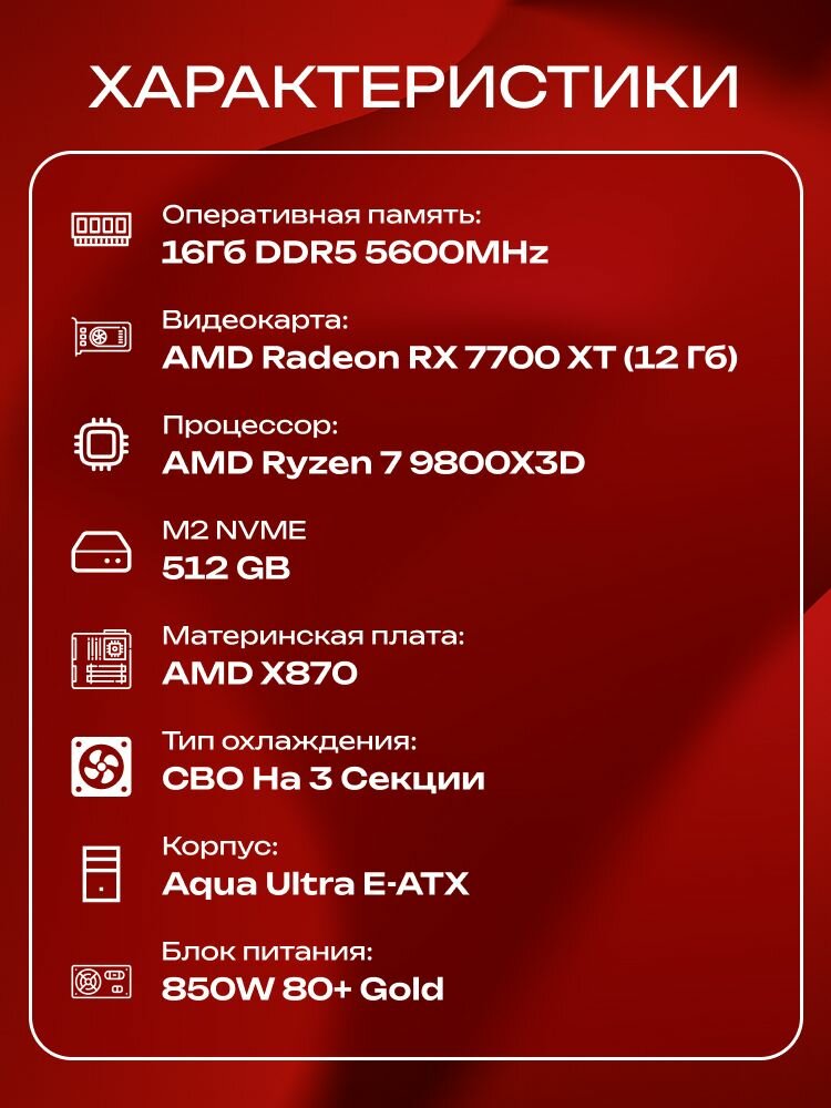 Aqua Ultra E-ATX AIO 360 чёрный, X870, R7 9800X3D AIO3, 512 NVME, 16 ГБ DDR5, RX 7700 XT (12 Гб), 850W