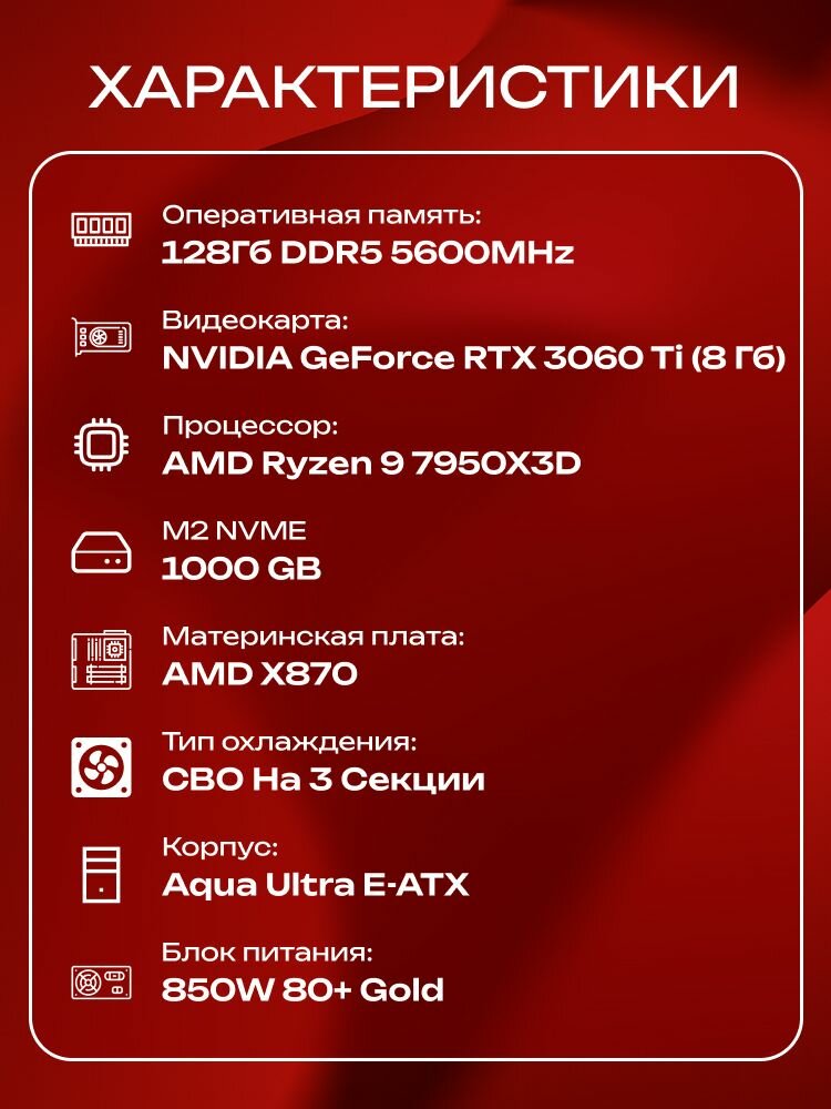 Aqua Ultra E-ATX AIO 360 чёрный, X870, R9 7950X3D AIO3, 1000 NVME, 128 ГБ DDR5, RTX 3060 Ti (8 Гб), 850W: сравнение цен, характеристики, фото, актуальное наличие и цены.