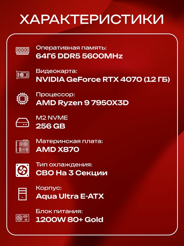 Aqua Ultra E-ATX AIO 360 чёрный, X870, R9 7950X3D AIO3, 256 NVME, 64 ГБ DDR5, RTX 4070 (12 ГБ), 1200W