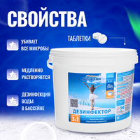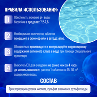 Описание: Таблетки белого цвета с синими вкраплениями с запахом хлора. Назначение: Комплексное обеззараживание воды и удаление водорослей. Область применения: для обеззараживания воды плавательных бассейнов объемом более 20 м3, кроме бассейнов медицинского назначения, предназначенных для лечебных процедур или с водой специального минерального состава. Антимикробная активность: бактерицидная, вирулицидная активность и действие на вегетативные формы спорообразующих микроорганизмов, предупреждает образование водорослей. Состав: трихлоризоциануровая кислота, сульфат алюминия, сульфат меди. Способ применения: