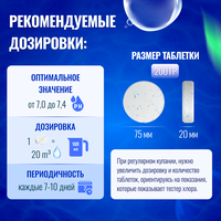 Перед применением дезинфицирующего средства необходимо обеспечить значение рН воды бассейна в пределах 7,2-7,6. Необходимое количество таблеток помещают в плавающую капсулу или в скиммер. При интенсивном использовании бассейна дозировку допускается увеличивать в соответствии с показаниями тестера хлора. При этом необходимо постоянно производить контроль и корректировку содержания активного хлора в воде с помощью тестера и осуществлять контроль за содержанием циануровой кислоты в воде бассейна. Вносить средство не менее чем за 4 часа до приема посетителей из расчета 1 таблетка на 30-50 м3 воды. Не бросать таблетки в бассейн (опасность обесцвечивания материалов).
