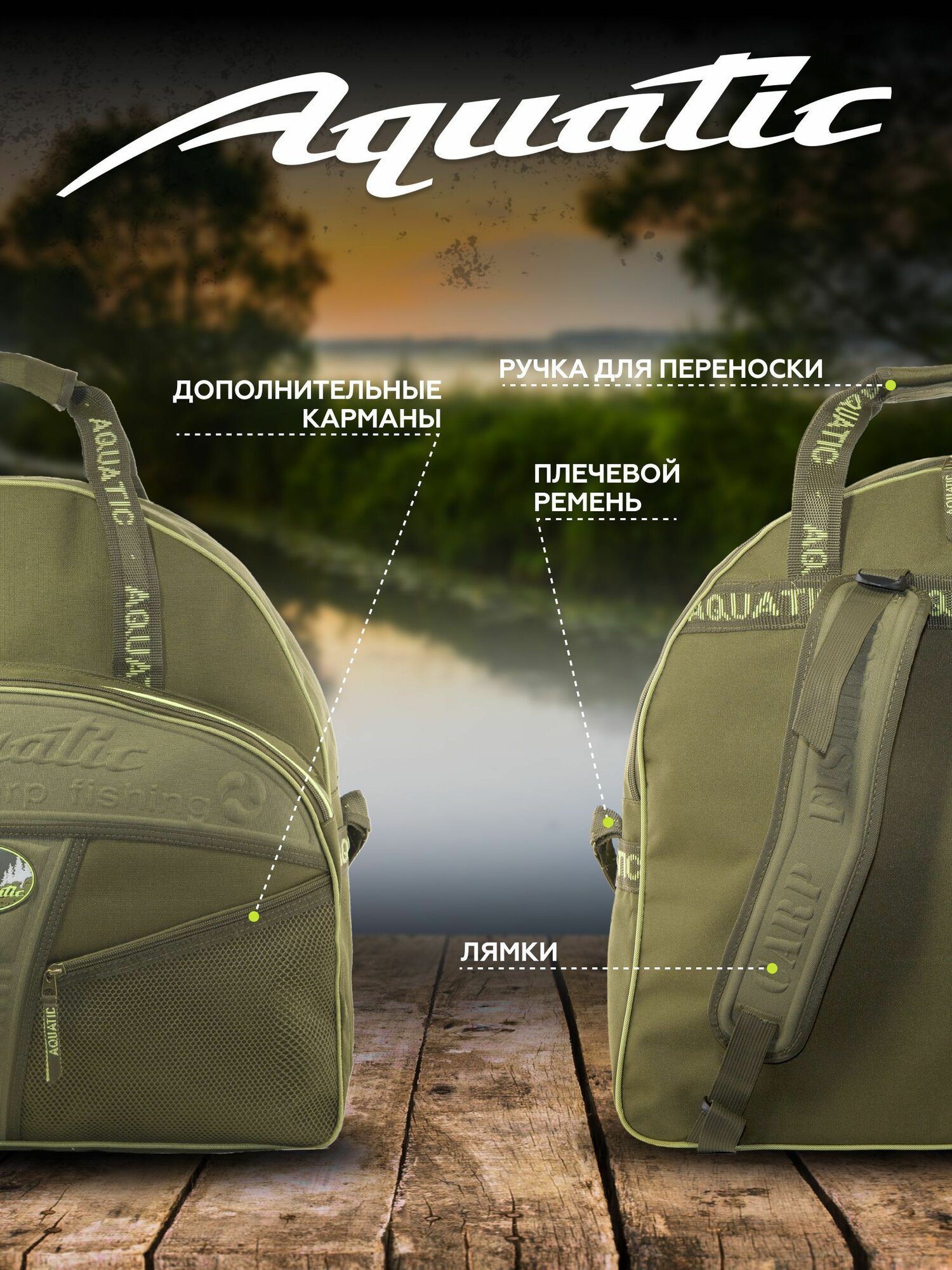Основное отделение сумки Aquatic С-06 достаточно объемно чтобы вместит несколько сложенных ведер для замешивания рыбного корма или иную габаритную поклажу в свернутом состоянии. Наружный накладной карман подойдет для хранения небольших элементов рыболовного снаряжения и личных вещей, которые требуют защиты от влаги. На внешней стороне накладного кармана размещены сетчатые кармашки для разной мелочи. Все шовные соединения прочные, надежные, усилены кедером.