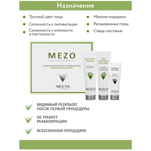 1. Микроигольчатая маска-пилинг Mezo-Spicule Peel Mask -100 мл 2. Интенсивная обновляющая сыворотка для лица Pro-Renew Skin Serum-50 мл 3. Интенсивная питательная маска для лица с экстрактом икры Ultra Nourishing Caviar Mask-100 мл Профессиональная пилинг-процедура для лица «Микроигольчатый пилинг» с успехом заменит аппаратные и инвазивные процедуры для получения видимого эффекта лифтинга, омоложения и обновления кожи. Комплексное действие уникального микроигольчатого пилинга из спикул, с восстанавливающей сывороткой и интенсивной питательной маской, запускает процессы омоложения, восстановления и обновления, обеспечивает быстрый видимый эффект подтянутой, свежей и гладкой кожи, а курсовое применение комплекса обеспечит пролонгированный стойкий результат.