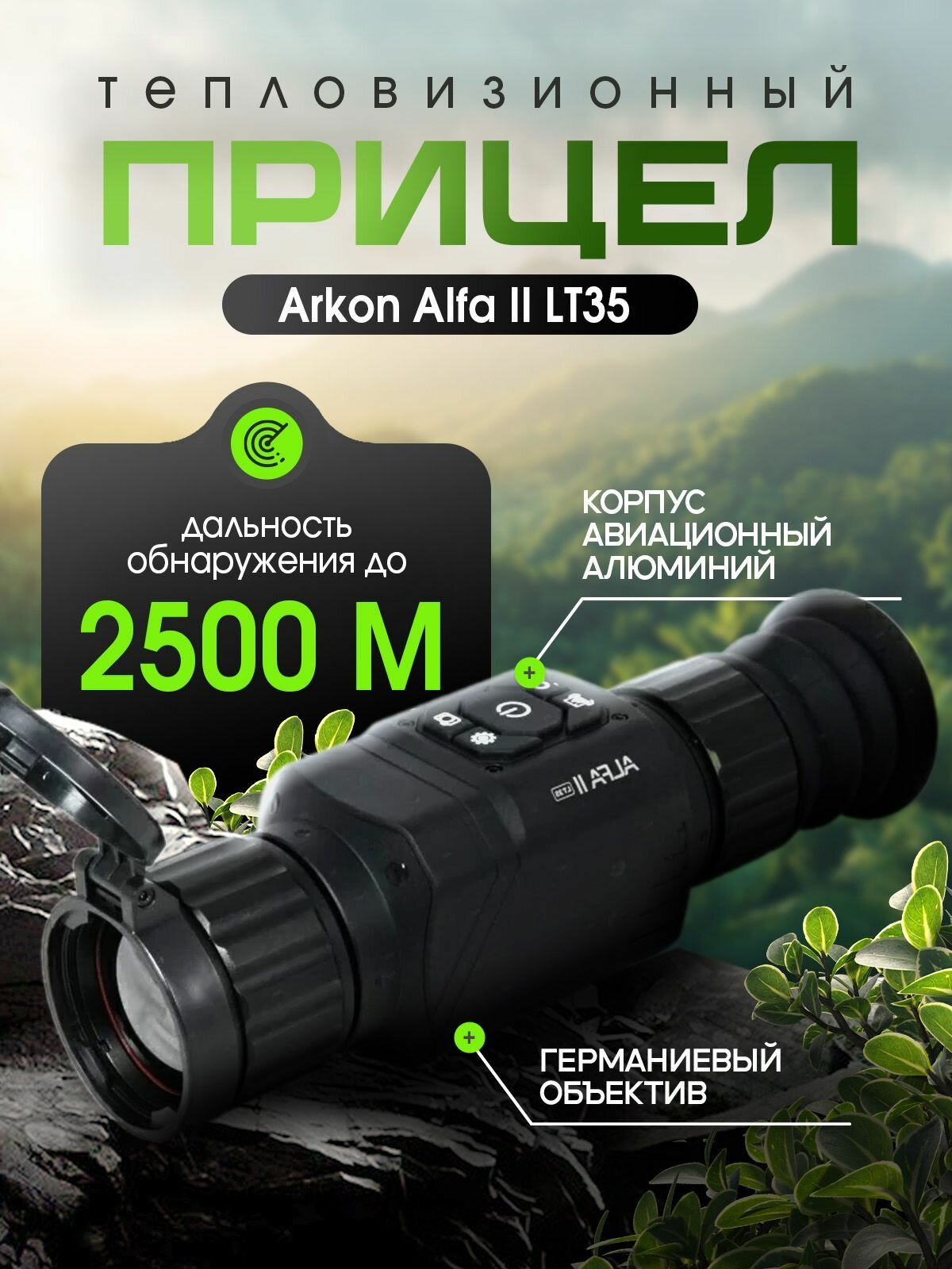Цифровой прицел ARKON ALFA II LT35 Внимание! К данному прицелу необходимо крепление - Кронштейн Weaver/Picatinny для Fortuna General (Фортуна) / Arkon Alfa II , в комплект не входит. Товар поставляется по 100% предоплате, перед оплатой уточняйте наличие, сроки и условия доставки у наших консультантов | Доставка в стоимость не включена, оплачивается отдельно. Прицел Arkon Alfa II LT35 – новая модель от компании Arkon Technologies выпуска 2023 года. Тепловидение построено на современном, ванадиевом ИК-сенсоре VOx 384 × 288 рх, обеспечивающем получение качественного термографического изображения с высоким уровнем детализации. Оптический модуль на германиевом объективе 35 мм/f1.0 предоставит внушительный диапазон увеличения. В отличие от модели предыдущего поколения, новый прицел работает на одном сменном аккумуляторе 18500. Время автономной работы устройства составляет более 5 часов. Прицел Arkon Alfa II LT35 – новая модель от компании Arkon Technologies выпуска 2023 года. Тепловидение построено на современном, ванадиевом ИК-сенсоре VOx 384 × 288 рх, обеспечивающем получение качественного термографического изображения с высоким уровнем детализации. Оптический модуль на германиевом объективе 35 мм/f1.0 предоставит внушительный диапазон увеличения. Прицел Arkon Alfa II LT35 имеет следующие характеристики: Дальность обнаружения объектов: (1,8 х 0,5м) — 2500 м Ванадиевый ИК-сенсор - VOx 384 × 288 рх, 12 μm, NETD<50 мК, 50 Гц Шесть цветовых палитр, отслеживание горячих точек Цветной OLED-дисплей (0.39’’), 50 Гц, разрешение 1024х768 пикселей Шесть типов прицельных сеток, доступна смена цвета подсветки Шесть пользовательских профилей, пристрелка одним выстрелом Объектив 35 мм/f1.0, увеличение 3х, Digital zoom 1х- 8х Угол поля зрения FOV 7,53° х 5,65° или 13,2 - 9,9 м/100м Функции записи видео, 64 Гб памяти (EMMC) Функция PIP «Картинка в картинке» Влагозащищенный корпус, класс IP67 Система питания – сменный аккумулятор 18500, внешнее питание USB Type-C Диапазон рабочих температур: от -20 до +60°С Габариты 197,4×72×61,2 мм, вес 0,56 кг Германиевый объектив 35 мм f1.0 Прицел Arkon Alfa II LT35 оснащен длиннофокусным германиевым объективом 35 мм/f1.0. Морозоустойчивый OLED дисплей Прицел оснащен современным OLED-дисплеем, который выводит изображение в разрешении 1024×768 пикселей. Передовой ИК-сенсор VOx 384 × 288 рх, 12 μm За тепловизионное видение у прицела Arkon Alfa II LT35 отвечает современный ИК-сенсор на основе оксида ванадия (VOx). Шесть цветовых палитр Стандартный набор из 6 цветовых палитр позволит выбрать оптимальные параметры отображения в зависимости от условий видимости, дальности наблюдения и специфики решаемой задачи. Прицельные сетки Пользователям Arkon Alfa II LT35 предоставлен выбор из шести прицельных сеток. Для стрельбы на дистанции прямого выстрела рекомендовано использование привычных охотничьих вариантов: «Крест», «Полукрест» и др. Пристрелка одним выстрелом Для приведения оружия к точному бою рекомендовано воспользоваться функцией быстрой пристрелки, существенно экономящей время и боеприпасы. Запись видео Встроенный видеорекордер позволяет записывать моменты удачных выстрелов Вашей охоты. Ролики сохраняются на внутренний накопитель объемом 64 Гб. Система питания В качестве источника питания для прицела Arkon Alfa II LT35 используется литиевый аккумулятор 18500 с емкостью 2000 mAh. Время автономной работы более 5-ти часов. Прочный корпус IP67 В качестве материала для корпуса использован сверхпрочный алюминиевый сплав. Кла