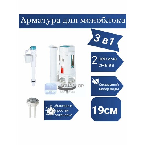 Двухкнопочный сливной механизм для ремонта большинства керамических цельных унитазов моноблок EVA GOLD, и других производителей Изготовлен из высококачественного ABS пластика и нержавеющей стали 304, прочный и устойчивый к коррозии, адаптируется к различному качеству водыВысота сливного механизма 30 см подойдет для высоты бака 345-445 ммНижняя прокладка арматуры подойдет для сливных отверстий диаметром 65-85 ммВ комплект входит 2-я кнопка с хромовым покрытием 58 мм, для отверстий 58-65 ммТак же в наборе идет впускной клапан для бачка G1/2 дюйма