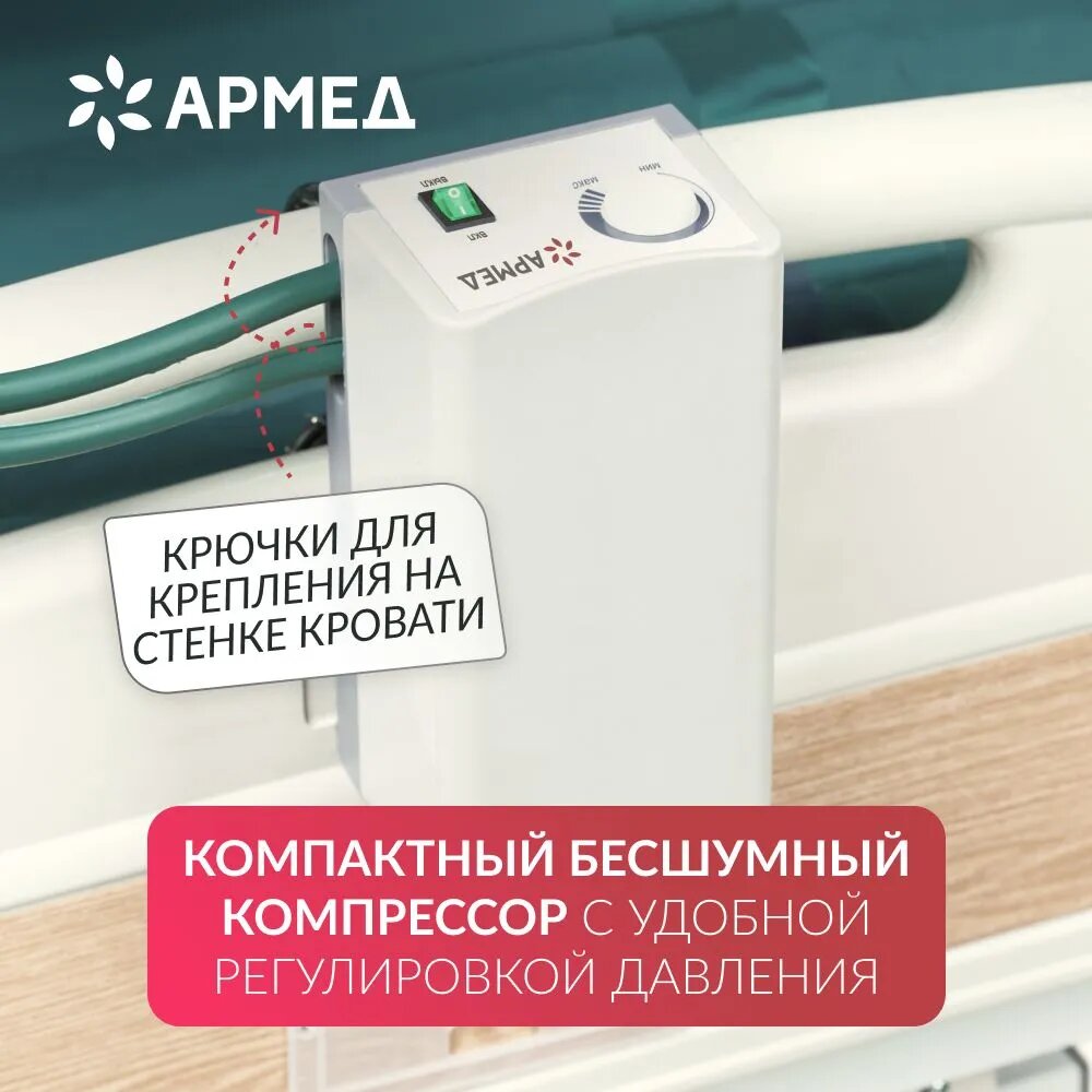 - Воздух распределяется по секциям за счет работы компактного компрессора, который прочно крепится на поручне кровати с помощью крючков. Благодаря плавной регулировке давления Вы подберете самое комфортное положение секций для пациента.