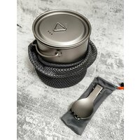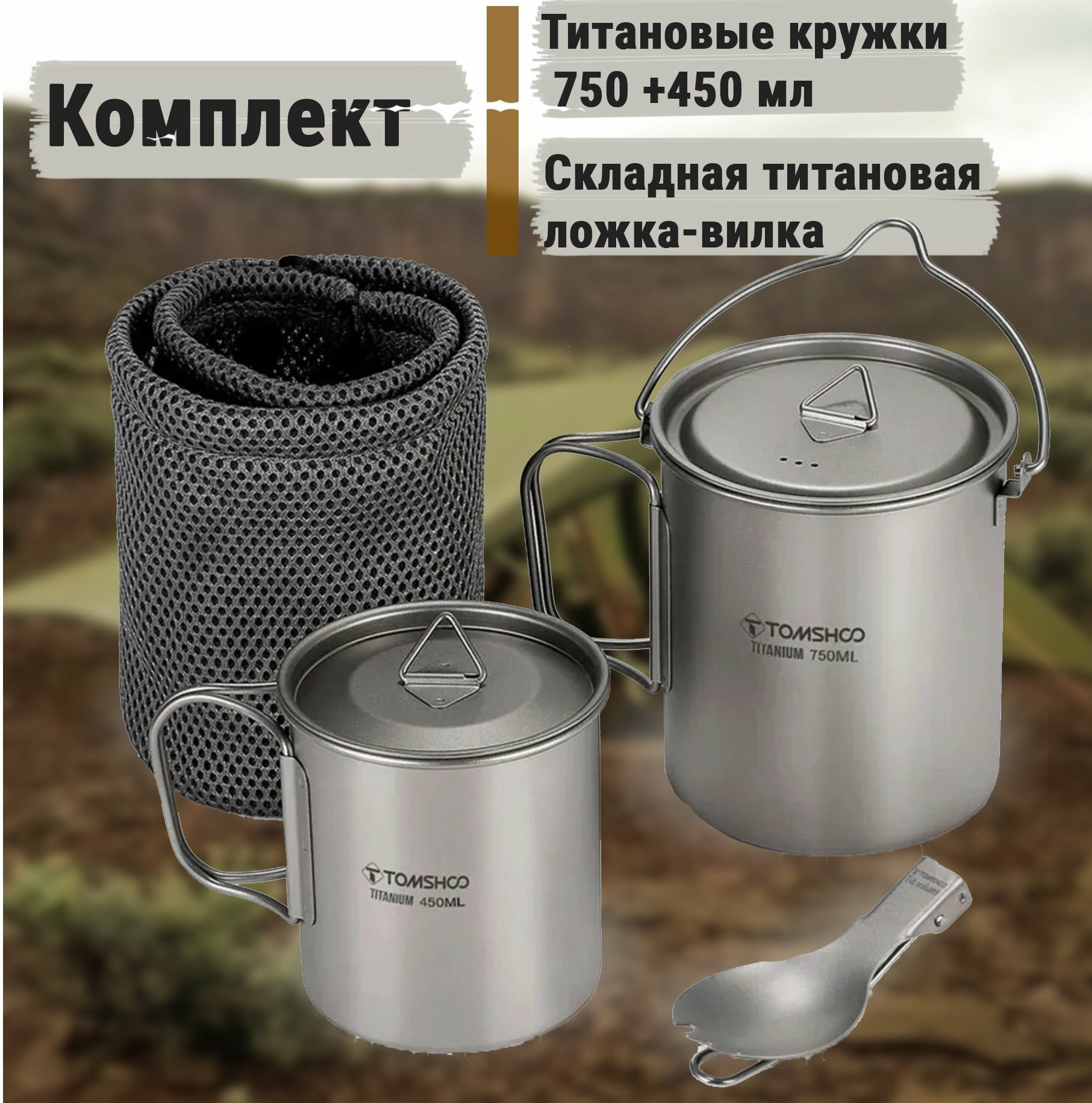 В комплекте: Титановая кружка-котелок 750мл и чехол; титановая кружка 450мл и чехол; титановая ложка-вилка в чехле;