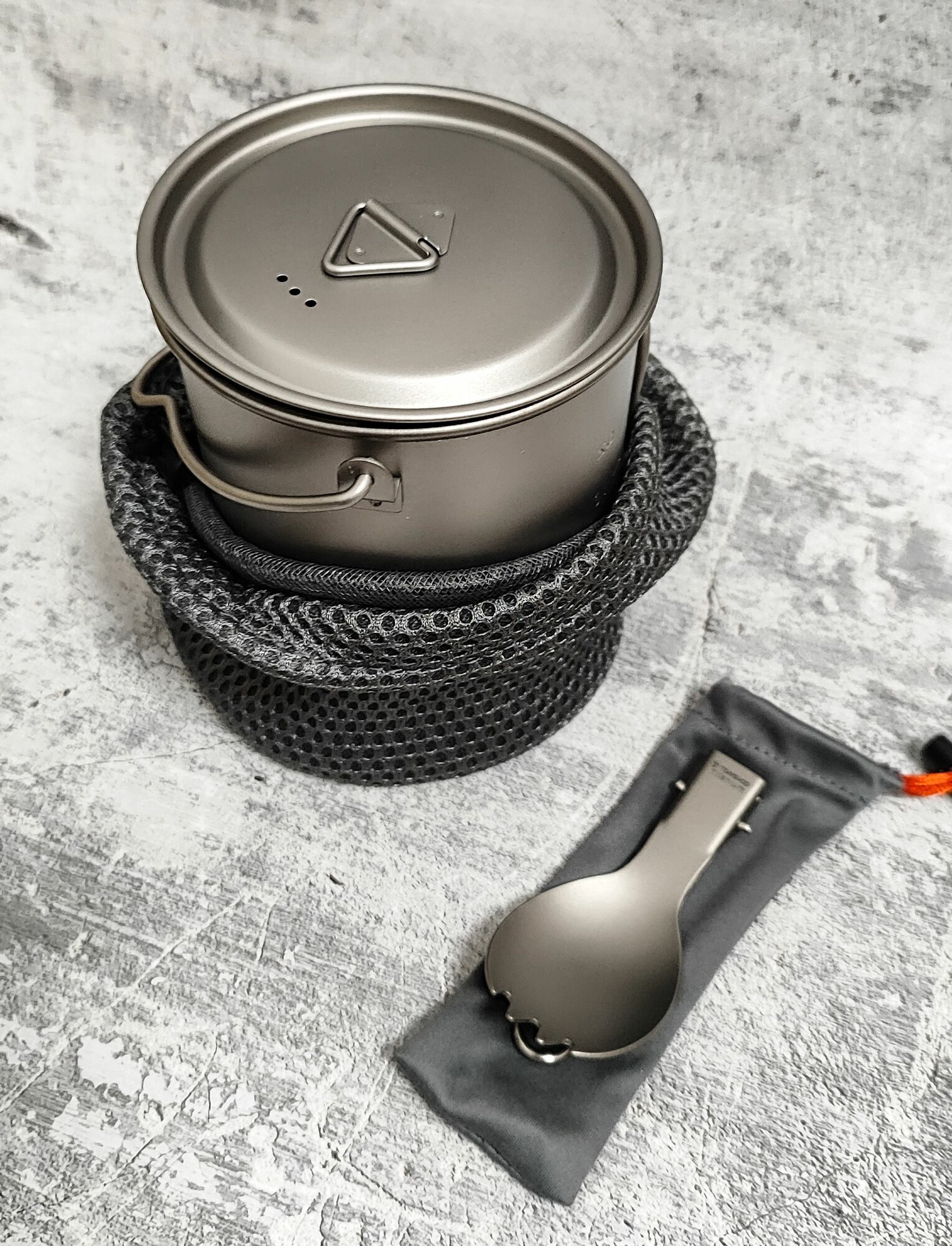 - Материал посуды - титан. Существенно облегчает снаряжение. Суммарный вес 270 г (с чехлами).