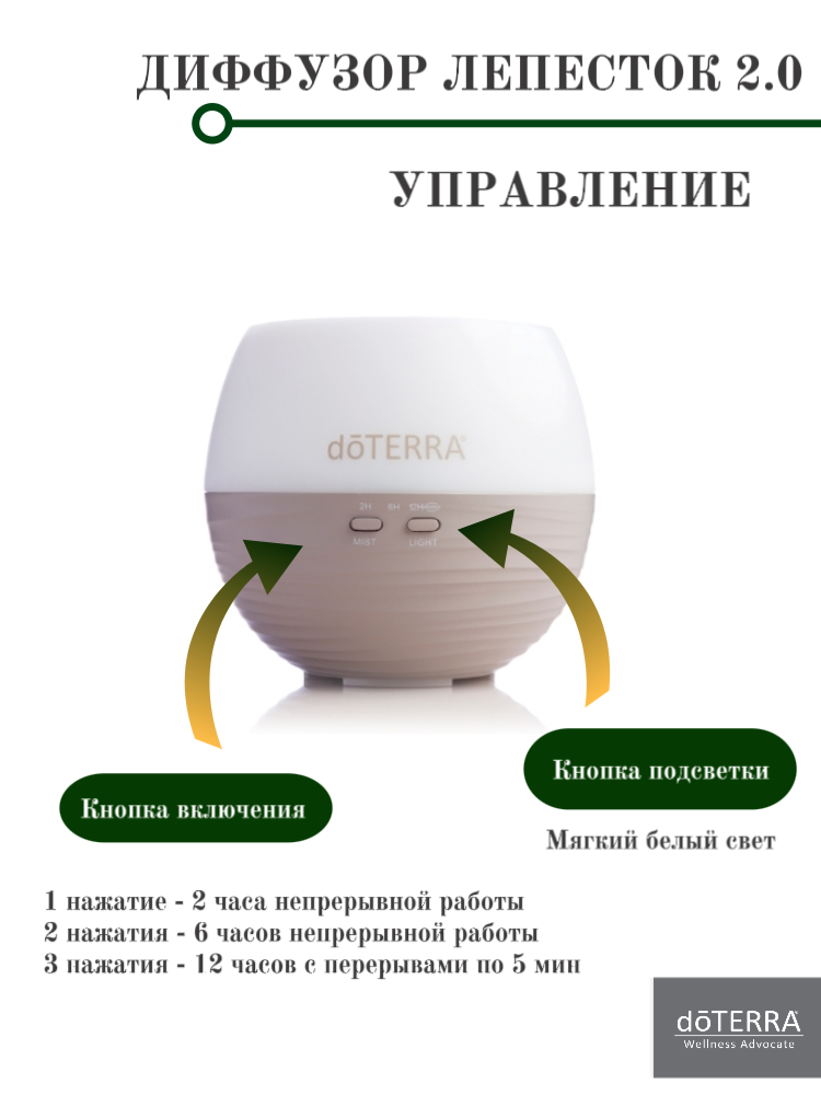 Диффузор Лепесток от doTERRA - это устройство, которое предназначено для использования с эфирными маслами. Он обеспечивает эффективное и равномерное распространение аромата, создавая приятную атмосферу в вашем доме.