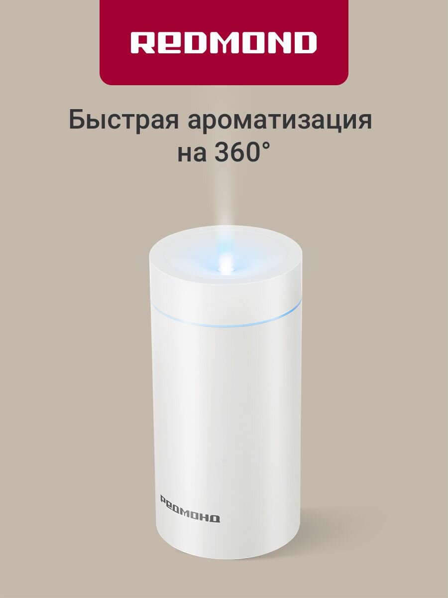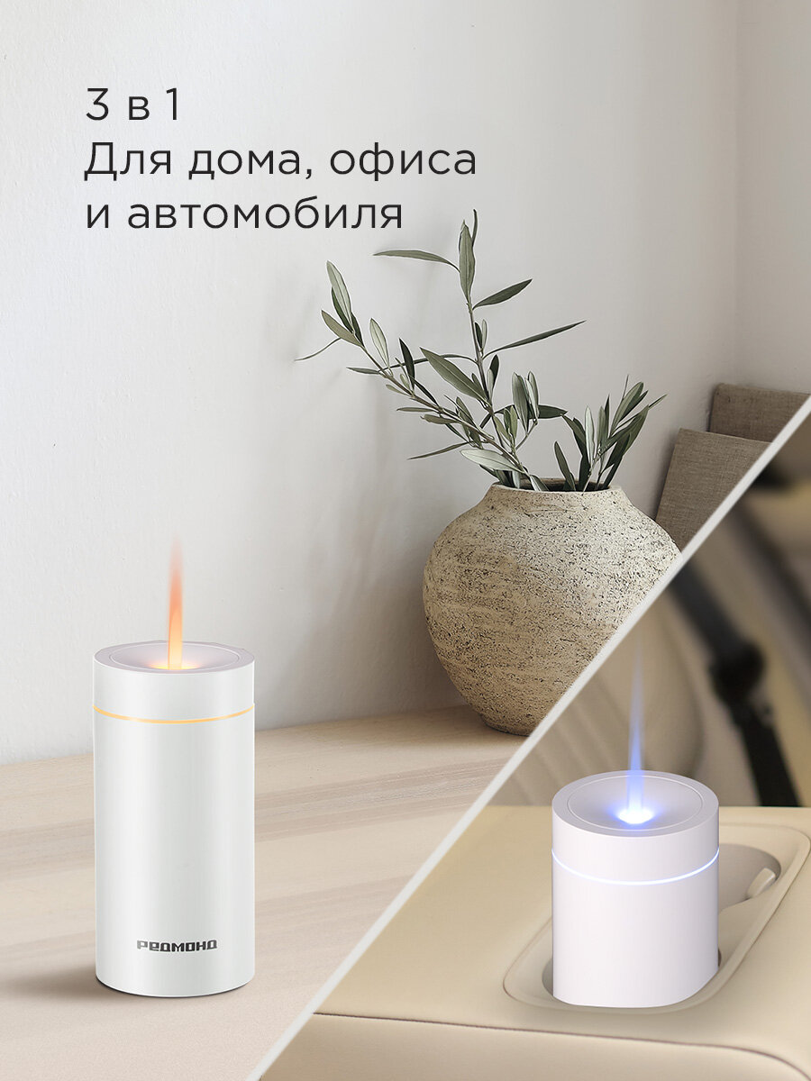 Redmond AD3302 — ультразвуковой компактный аромадиффузор, который быстро наполнит комнату или салон автомобиля приятным ароматом. Высокочастотные вибрации мембраны превращают эфирное масло и воду в мелкодисперсный туман, который равномерно распространяется по помещению. Подсветка с эффектом свечи добавит пространству особый уют. Диффузор работает до 5 часов без подзарядки: смело берите его в дорогу.3 В 1AD3302 ароматизирует и эффективно увлажняет воздух в помещении. Наполните любимыми ароматами любое пространство: дом, салон автомобиля, небольшой офис. Быстрая ароматизацияаромадиффузор работает по ультразвуковой технологии — аромат эфирных масел равномерно и быстро распространяется по помещению. Понадобится совсем немного времени, чтобы комната наполнилась любимым запахом. Ультразвуковое распылениедостаточно всего 2–3 капли аромамасла на 100 мл воды, чтобы создать уют в квартире. Небольшой расход масел позволит сэкономить средства и продлить удовольствие от ароматерапии. Эффект свечиаромадиффузор AD3302 оснащен подсветкой с визуальным эффектом пламени свечи. Подсветка в электрическом устройстве безопасна: можно использовать диффузор в присутствии детей и питомцев.7 цветов подсветкивыбирайте цвет контурной подсветки в зависимости от настроения или включайте режим, чтобы они менялись по кругу. Аромадиффузор с подсветкой может служить ночником: это оценят те, кому некомфортно засыпать в темноте. До 2 часов работымощность аккумулятора 2000 мА*ч — диффузор будет беспрерывно работать до 2 часов без подзарядки. Он компактный, и его удобно брать с собой.