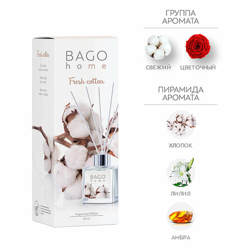Аромадиффузор Bago home Свежий хлопок 50 мл. Время работы от 4 до 6 недель. Площадь ароматизации от 5 до 15 м. Свежий аромат хлопка в сочетании со сладкой лилией. Пирамида аромата: хлопок, лилия, амбра. Bago home — это бренд ароматов для дома с европейским качеством. Главные ценности компании — создавать натуральные и экологически чистые ароматы для каждого дома. Огромная палитра ароматов, авторский дизайн, безопасный состав и контроль всего цикла производства — все это делает компанию уникальной на международном рынке, где бренд Баго хоум знают и любят уже в 12 странах. Базовая коллекция бренда, основа основ. Естественно звучащие фруктовые и цветочные ароматы подойдут как тем, кто раньше не ароматизировал помещения, так и давним ценителям парфюмерии для дома. Откройте бутылку, освободите палочки или их аналог от скотча, если он есть, и затем поставьте их в ароматическую жидкость.