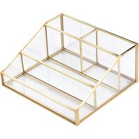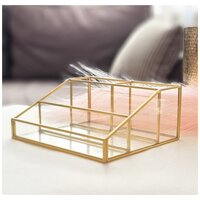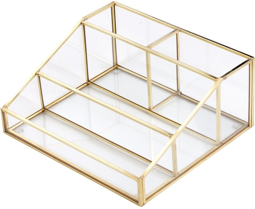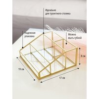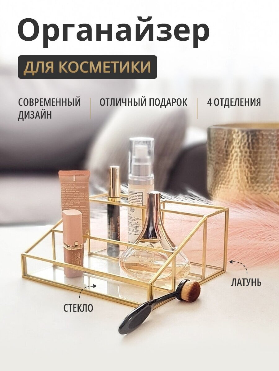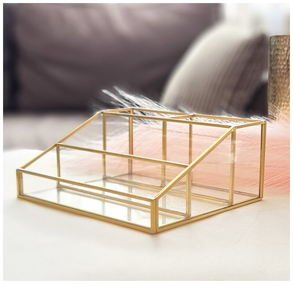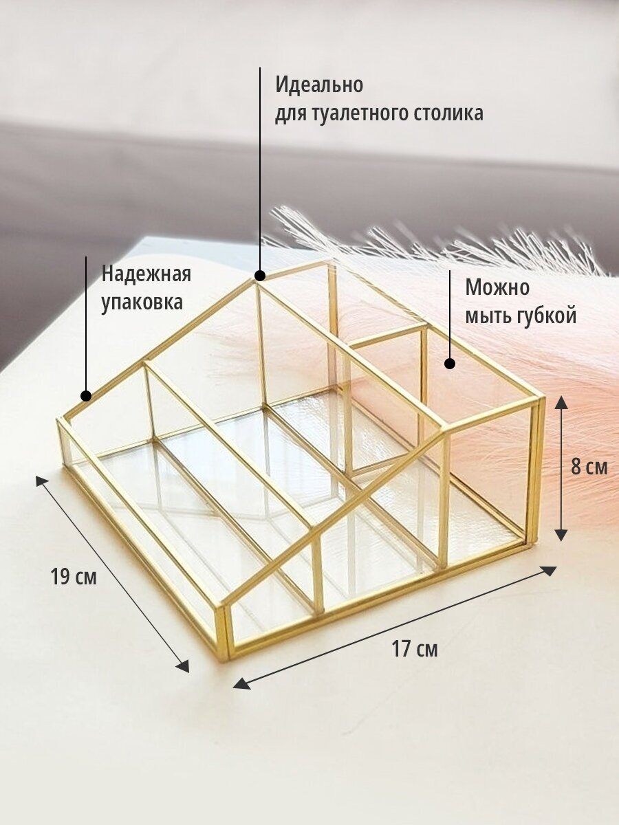 Вам нужен удобный органайзер для хранения косметики? -И он должен быть еще и очень стильный? У нас есть готовое решение. Этот модный органайзер мы специально разработали для вас. Он займет достойное место в интерьере и ваша косметика будет в полном порядке! Органайзер из прозрачного бесцветного стекла и латунного профиля. Имеет 4 отделения под разные виды косметики и аксессуары: 2 отделения 9х4,5 см, 1 отделение 18х4,5 см, 1 отделение 18х6,5 см. уход: Можно мыть водой с применением пенящихся средств для мытья посуды и стекол. Протирать насухо мягкой тканью. - Упаковка: транспортировочная коробка из гофрокартона. При получении продукции из стекла в ПВЗ или у курьера проверяйте все стеклянные изделия на целостность. Изделие не должно быть со сколами, трещинами, царапинами или разбито. В противном случае претензии на возврат приниматься не будут.
