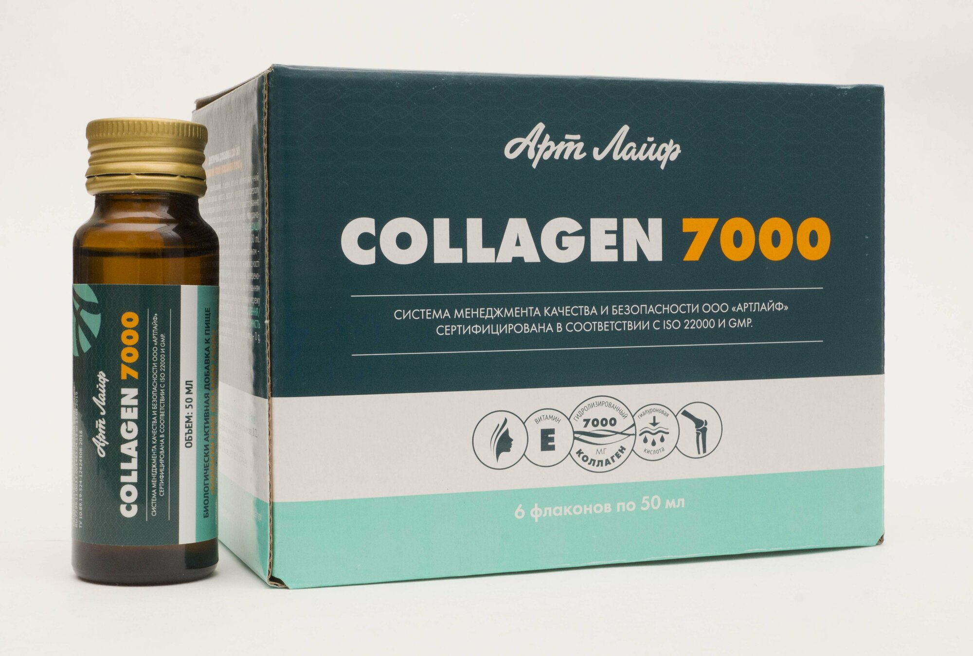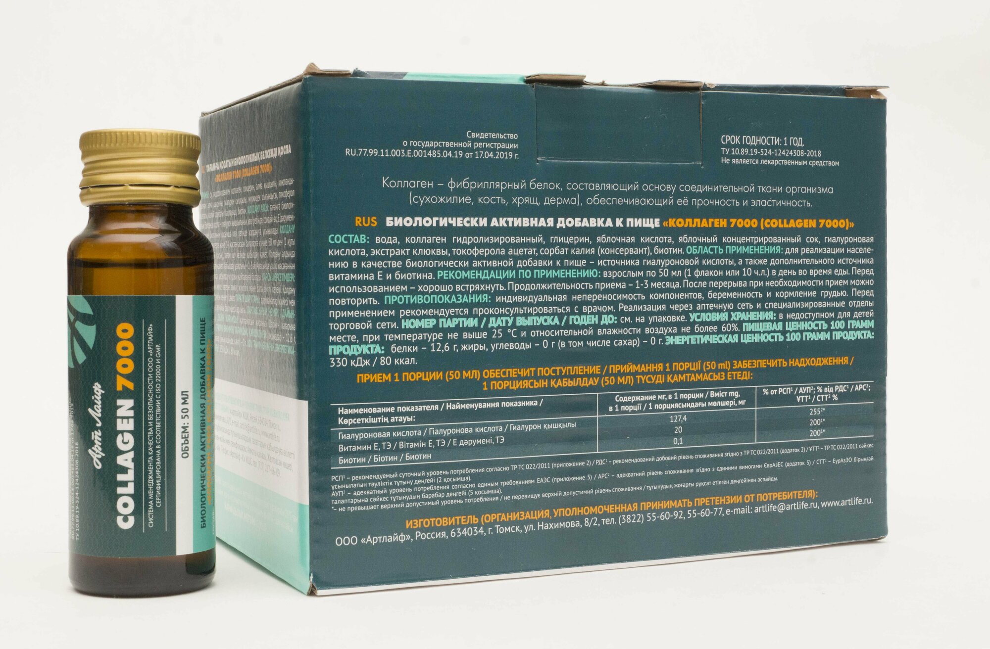 Напиток с повышенным содержанием гидролизата коллагена (7000 мг) для поддержки суставов, волос, кожи и ногтей в здоровом состоянии. Формула для ежедневного применения с приятным фруктово-ягодным вкусом. Не содержит сахара. Всего 40 ккал. Питьевой коллаген с гиалуроновой кислотой, биотином и витамином Е. Комплекс с повышенным содержанием гидролизата коллагена (7 000 мг), направлен на решение и поддержание целого ряда систем организма: · в коже – отвечает за гладкость и упругость. · в суставах – укрепляет связочный аппарат и хрящевую ткань. · в костях – образует сеть волокон, в которой откладывается кальций. Чем крепче коллагеновая сетка, тем прочнее кости. · в ногтях и волосах – укрепляет структуру и стимулирует рост. · в мышцах – участвует в образовании новых мышечных волокон. · в деснах коллаген удерживает зубы (из него состоит периодонтальная связка). · в сосудах – поддерживает их эластичность и участвует в поддержании артериального давления. · для глаз – гиалуроновая кислота, входящая в состав препарата, способствует снижению утомляемости глаз, сохранению увлажненной конъюнктивы, даже при длительной работе за компьютером и использовании контактных линз. · улучшение дренажной функции организма, защита от повреждающего действия свободных радикалов, усиление репаративной функции (ускоряет заживление тканей). Коллаген — один из главных структурных белков нашего организма. Он входит в состав, волос, ногтей, кожи, внутренних органов, костей, десен, суставов, сосудов, соединительной ткани. Коллагеновые волокна являются основой дренажной системы нашего организма - они образуют «внутренний каркас», заполняя пространства между клетками и обеспечивают перемещение жидкости в тканях. Коллаген 7000 содержит гидролизированный (низкомолекулярный) водорастворимый коллаген, который уже расщеплен до аминокислотных остатков. Аминокислоты коллагена всасываются в кишечнике и направляются к специальным клеткам (фибробластам), которые «соединяют» поступившие аминокислоты уже в наш собственный коллаген. Коллаген 7000 содержит 18 аминокислот, 6 из которых являются незаменимыми. Аминокислоты, как маленькие кирпичики, скрепляясь друг с другом в различных последовательностях, образуют совершенно разные белки (из них строятся кожа, волосы, ногти, кости, ферменты, гормоны и др.) Часть аминокислот, организм может производить для себя сам – заменимые аминокислоты, а часть — может получить только извне - незаменимые аминокислоты. Очень важно, чтобы в организм поступали именно незаменимые аминокислоты, так как они входят в состав многих белков и их дефицит может привести к ухудшению работы организма. Гидролизированный коллаген является природно-сбалансированным комплексом аминокислот, обеспечивая организм «строительным материалом», восстанавливает и укрепляет все соединительнотканные структуры нашего организма. Коллаген 7000 содержит 7000 мг коллагена в одной бутылочке, это количество является оптимальным и эффективным (согласно рекомендациям экспертов, 5000 мг коллагена – это профилактическая доза; 10000 мг – лечебная доза). Входящие в состав Коллагена 7000 биотин, витамин Е и гиалуроновая кислота помогают синтезировать собственный коллаген высокого качества, защищают клетки от свободнорадикального повреждения, стимулируют рост ногтей и волос, 