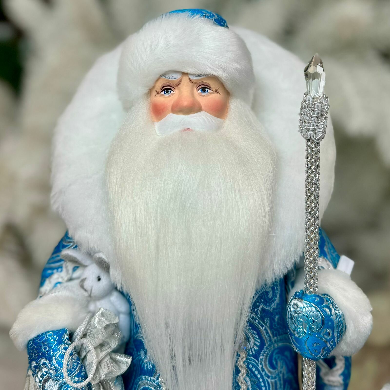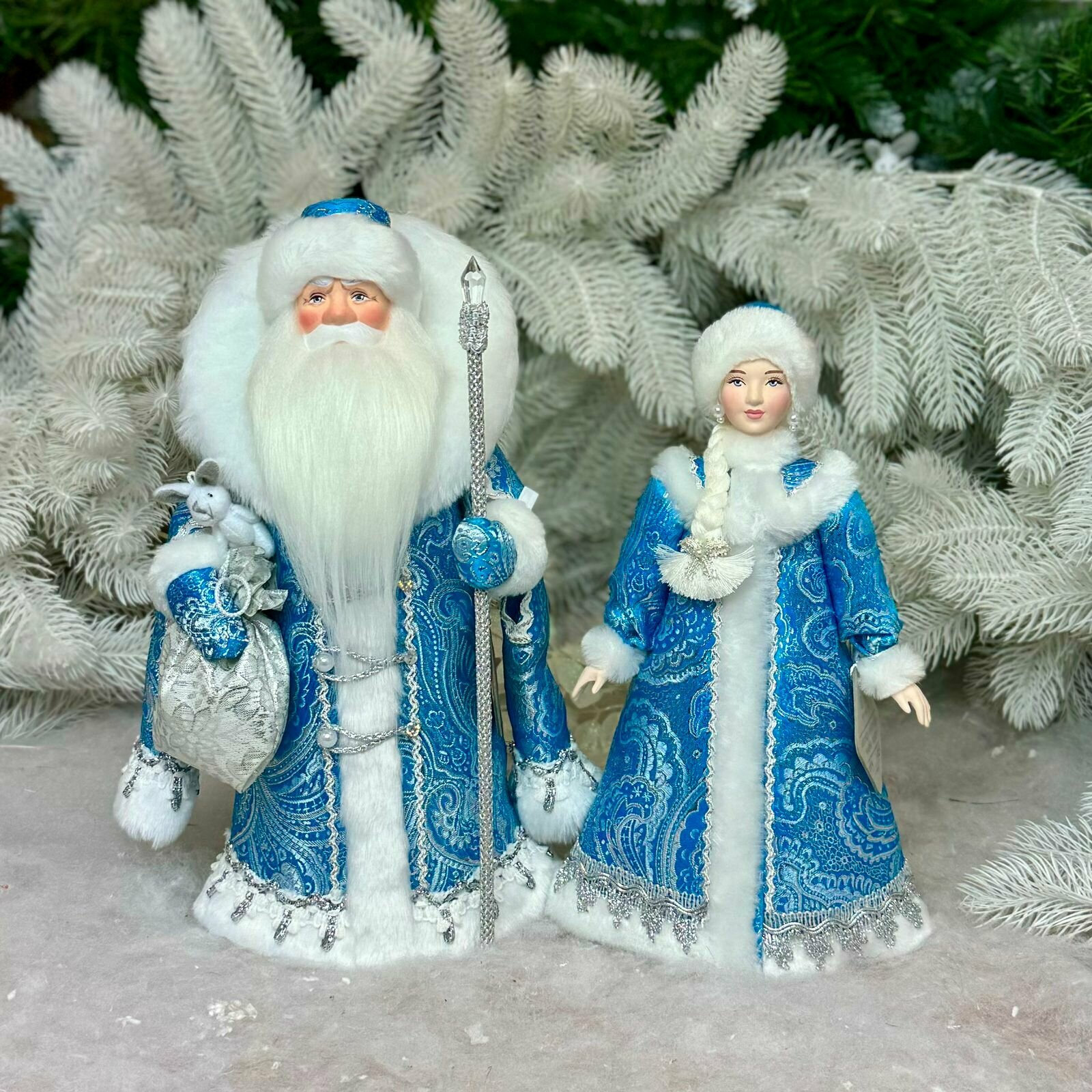 Дед мороз под елку 32см в бирюзовой шубе с серебряной отделкой. Снегурочка под елку 28см в бирюзовой шубке. Внутри конусный каркас, дно закрыто тканью.