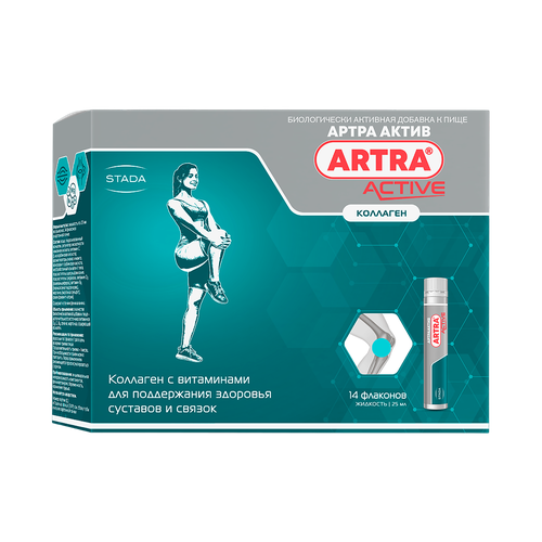 Коллаген является основным белком соединительной ткани, которая присутствует во всех органах. Соединительная ткань составляет 50% от массы тела человека. Значение соединительной ткани весьма велико особенно для сухожилий, хрящей, костей и суставов. Коллаген образует нити (фибриллы) различной толщины и плотности. Расположение нитей определяет их функцию, которая придает тканям прочность и форму. Выделяют несколько типов коллагена в соединительной ткани. Так, межкостные связки служат для укрепления разных видов соединений костей, для укрепления суставов. Некоторые из связок могут выдерживать очень большую нагрузку на растяжение. Построены они в основном из коллагеновых волокон, имеющих перекрестный и косой ход. Хрящевые соединения представляют собой хрящевые прослойки между костями. Они обладают значительной прочностью и упругостью, благодаря чему могут выполнять функции рессорного характера (пружины). Подвижность этого вида соединений сравнительно невелика и зависит от высоты данной хрящевой прослойки. Примером может служить позвоночник, между позвонками которого находится хрящ, толщина которого небольшая. Синовиальные соединения, или суставы, характеризуются рядом особенностей. Степень подвижности в том или ином суставе зависит от особенностей его строения, и прежде всего от формы сустава. Соединяющиеся в суставе поверхности костей покрыты слоем другого типа хряща, гладкая поверхность которого облегчает движение одной кости относительно другой. Эластичность хряща в суставах способствует смягчению ударов и сотрясений при ходьбе, прыжке и других движениях. Способность хряща деформироваться во время физической нагрузки и снова восстанавливаться после, придает сеть из коллагена, которая обеспечивает функцию сопротивления растяжению и необходима для поддержания объема и формы ткани. Недостаток коллагена в этих тканях или нарушение целостности структур может привести к ограничению движения, напряжению и хрусту в суставах. Биологически активная добавка к пище артра актив (далее артра актив) наполняет организм двумя видами коллагена, которые могут улучшать двигательную функцию сустава. Комплекс на основе высокого содержания коллагена может быть полезен для людей, ведущих активный образ жизни, которые хотят защитить суставы от преждевременного износа, восполнить запасы коллагена в организме, а также поддержать скелетно-мышечную систему в хорошем состоянии. Артра актив помимо коллагена, усилена комплексом антиоксидантов (селен, марганец и витамин С), которые защищают от окисления клетки хряща, способствуя уменьшению разрушения хряща. Условия реализации: населению. Места реализации определяются национальным законодательством государств-членов Евразийского экономического союза.