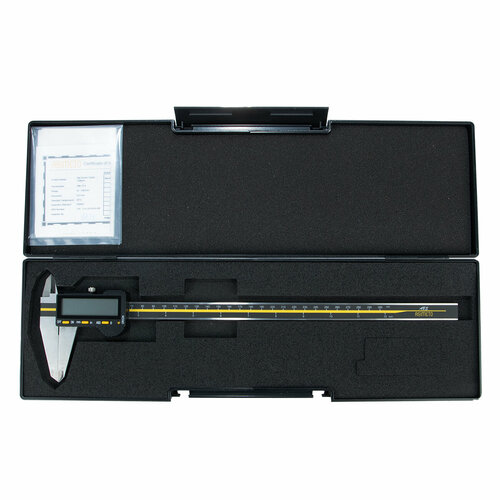 Цифровой штангенциркуль ASIMETO 306-12-4 для измерения наружных и внутренних размеров. При работе с цифровыми штангенциркулями результат измерений отображается на дисплее. Инструмент используют, когда данные необходимо получить быстро, без расчёта дополнительных шкал.
