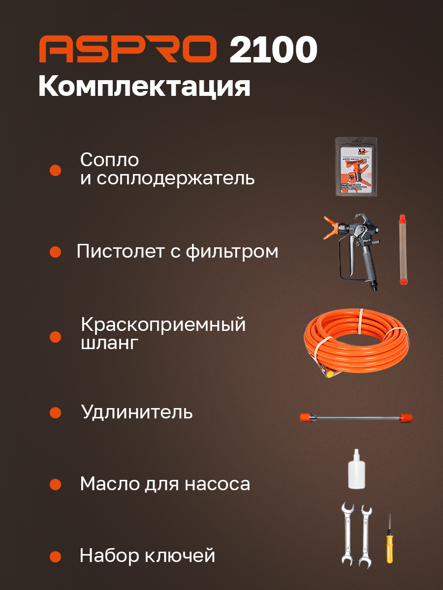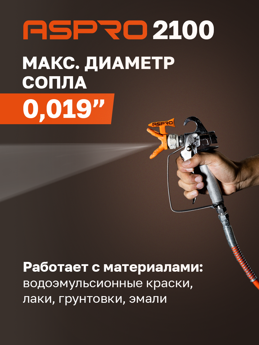 ASPRO-2100 – это окрасочный аппарат нового поколения, который сочетает в себе высокую производительность, простоту использования и надежность. Этот аппарат был разработан для профессионального использования в строительстве, отделке и других отраслях, где требуется быстрое и эффективное нанесение краски на поверхности.