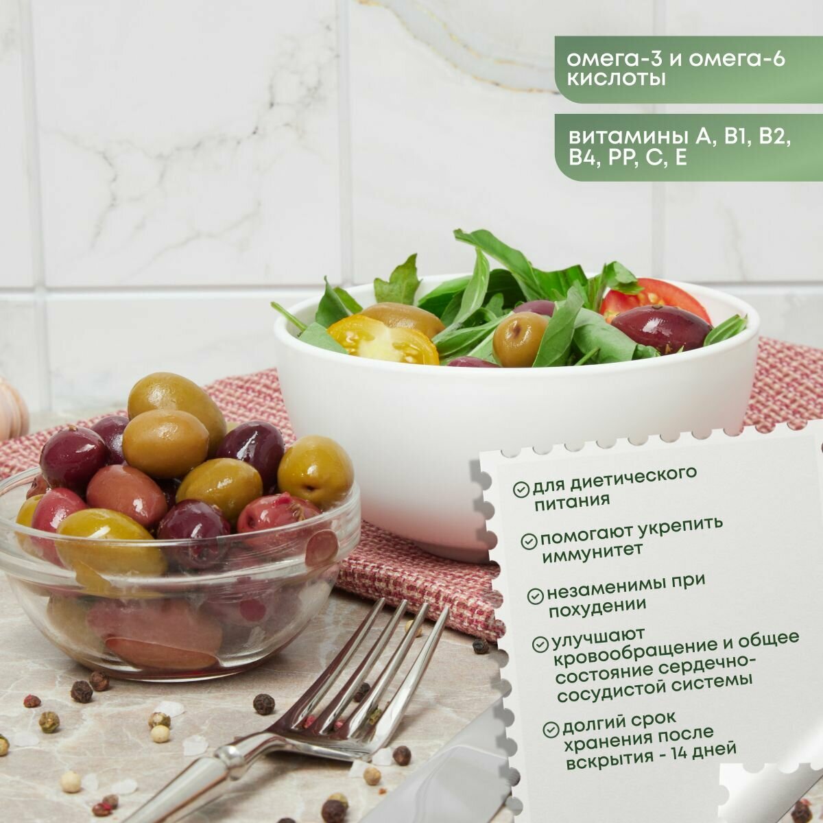 Забудьте всё, что вы знали об оливках и маслинах - Лучшие греческие оливки, краеугольный камень средиземноморской диеты. Ассорти из маринованных оливок - это смесь из двух разных видов греческих оливок (Каламата, натуральные зеленые Халкидики). У этих восхитительных сортов оливок есть свои тонкие отличия в аромате и вкусе, поэтому в результате получается смесь, идеально подходящая для разных видов закусок. Это самый популярный сорт оливок, широко используемый в кулинарии. Эти оливки mix с приятной текстурой, насыщенным и богатым вкусом. Они могут быть поданы как закуска перед обедом, как часть простого или сложного блюда, и даже быть здоровым и полезным перекусом в течение дня. Добавленные в пасту, в блюда из риса и в домашний хлеб, придадут цвет, вкус и фантастический аромат. Полезные и универсальные, выращенные с любовью и в традиционной манере, высоко ценятся как в Греции, так и в мире. Оливки каламата с косточкой выращивают исключительно на полуострове Халкидики, Греция. Маслины собираются вручную, хранятся в резервуарах с самой современной системой и консервируется по старинным рецептам. Крупные плоды, в отличие от итальянских и турецких, сохраняют хрустящую мякоть с пряным ароматом и фруктовой ноткой. Не фаршированные оливки имеют большие размеры. Их можно использовать для приготовления блюд, целиком или нарезать в салат.