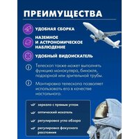 | Комплектация | Труба телескоп, сборный штатив, подставка для окуляров, система фокусировки, видоискатель, азимутное крепление, набор окуляров 20мм, 6мм, линза Барлоу, зеркало, ручка управления и фиксации, адаптер для телефона |