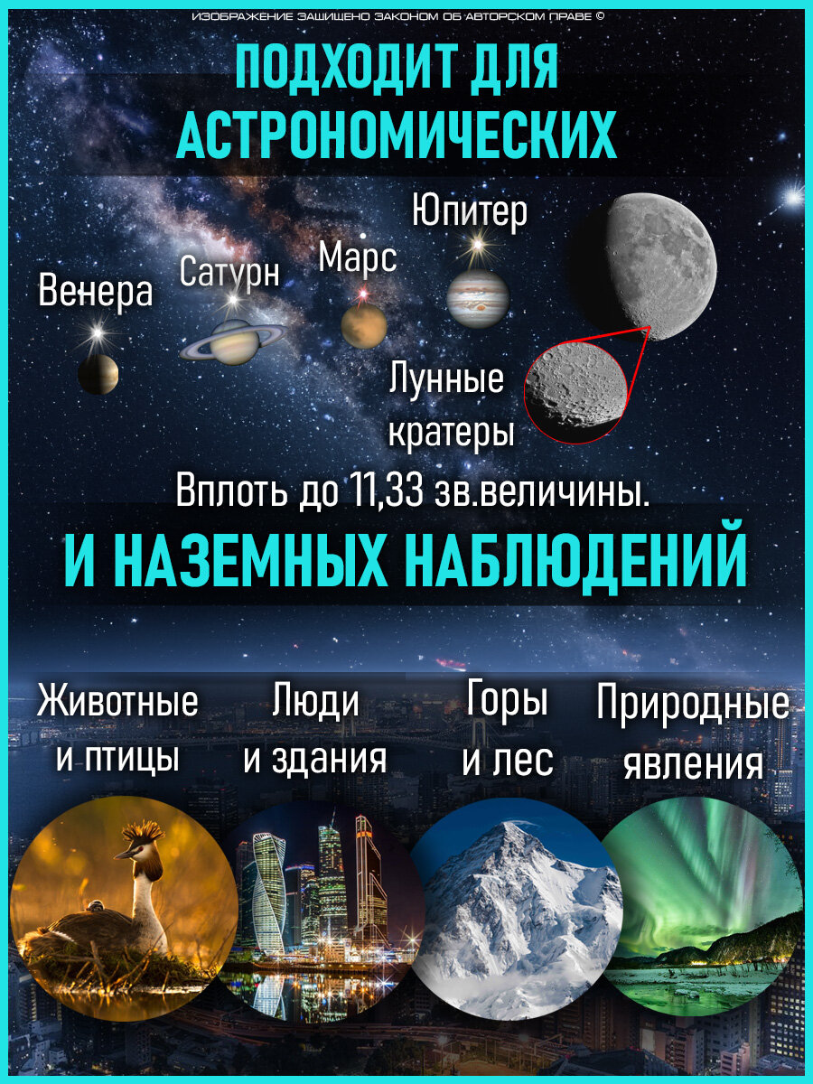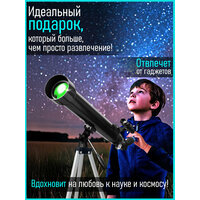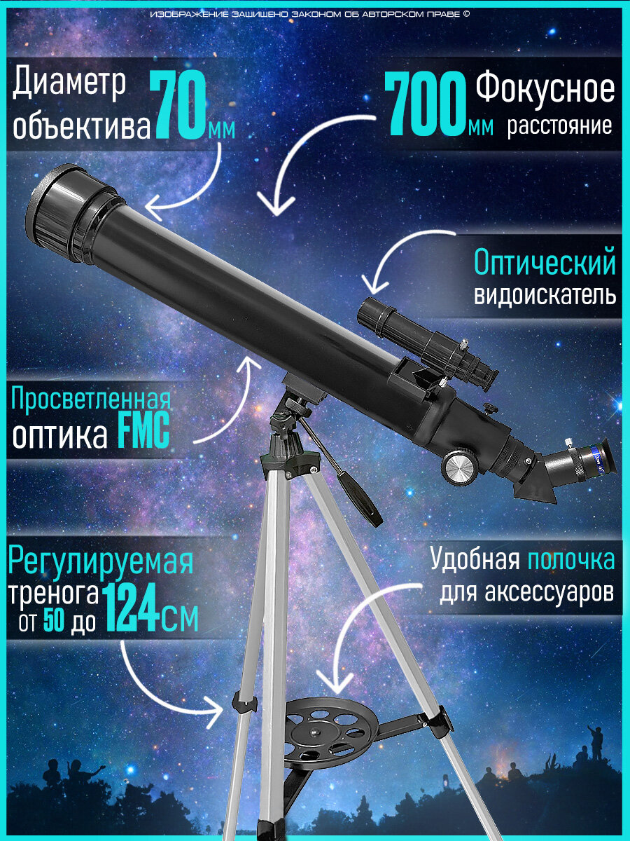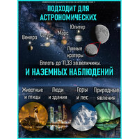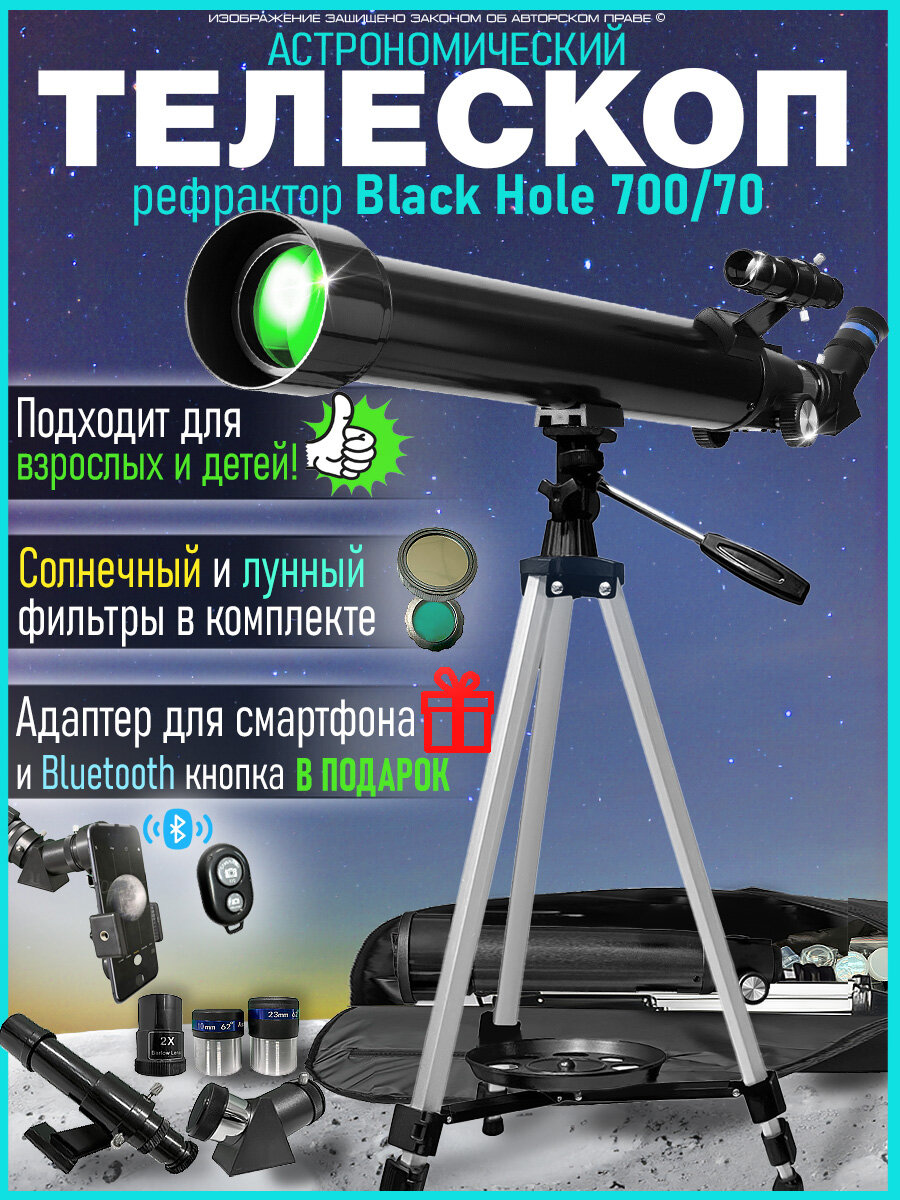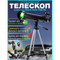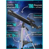| Комплектация | Труба телескопа 700/70 рефрактор; Защитные крышки для объектива и диафрагмы; Оптический искатель с кронштейном; Диагональная угловая призма; Линза Барлоу 2х; Окуляр 10 мм (70x); Окуляр 23 мм (28х); Лунный фильтр; Солнечный фильтр; Телескопический штатив (тренога); Большая сумка для хранения и транспортировки; Малая сумка для хранения аксессуаров; Универсальный держатель для смартфона; Беспроводной Bluetooth пульт для смартфона; Салфетка для протирки оптических линз; Документация. |