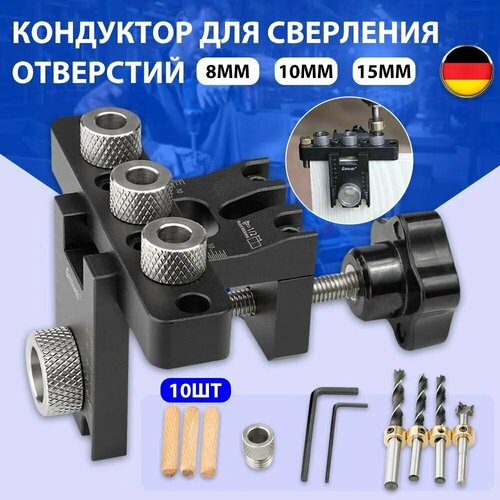 Кондуктор для сверления отверстий Кондуктор для сверления отверстий мебельный с упором представляет собой дырокол для деревообработки 3 в 1 с возможностью пробивки соединений. Используя качественный шаблон, даже мастера любители смогут быстро выполнить точные соединения под углом. Компактный инструмент изготовлен из высококачественного алюминиевого сплава и нержавеющей стали для длительного срока службы. Кондуктор для изготовления мебели оснащен сверлами диаметром 8 мм, 10 мм и 15 мм, гарантируя быстрое позиционирование для древесины разной толщины. Инструмент строительный прост в эксплуатации и доступен по цене. Комплект приспособлений быстро окупит себя и обеспечит точные результаты, затрачивая меньше времени и усилий. Данный тип локатора перфорации также используется для монтажа и высококачественных аксессуаров для шлифовки. Для мебельных петель в наличии 3 круглых стержня 2 шестигранных ключа, в том числе 1 направляющая для сверла и 1 направляющий штифт. Характеристики Материал: алюминиевый сплав,Нержавеющая сталь Толщина детали: 10-25 мм Диаметр сверл: 8 мм, 10 мм, 15 мм Макс. глубина сверления: 48 мм шестигранный ключ - 2 шт КомплектацияКондуктор-шаблон с переставным узлом - 1 шт Сверло с регулируемым ограничителем 8 мм - 2 шт Сверло с регулируемым ограничителем 10 мм - 1 шт Сверло с регулируемым ограничителем 15 мм - 1 шт Латунный ограничительный блок - 1 шт втулки 8 мм - 3 шт Втулка 15 мм - 1 шт Втулка 10 мм - 1 шт Шестигранный ключ - 2 шт Деревянный стержень - 3 шт