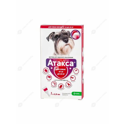 Атакса — препарат для защиты собак от укусов иксодовых клещей, блох и комаров. Обладает длительным защитным и репеллентным действием: не только уничтожает, но и отпугивает паразитов на протяжении 4 недель.