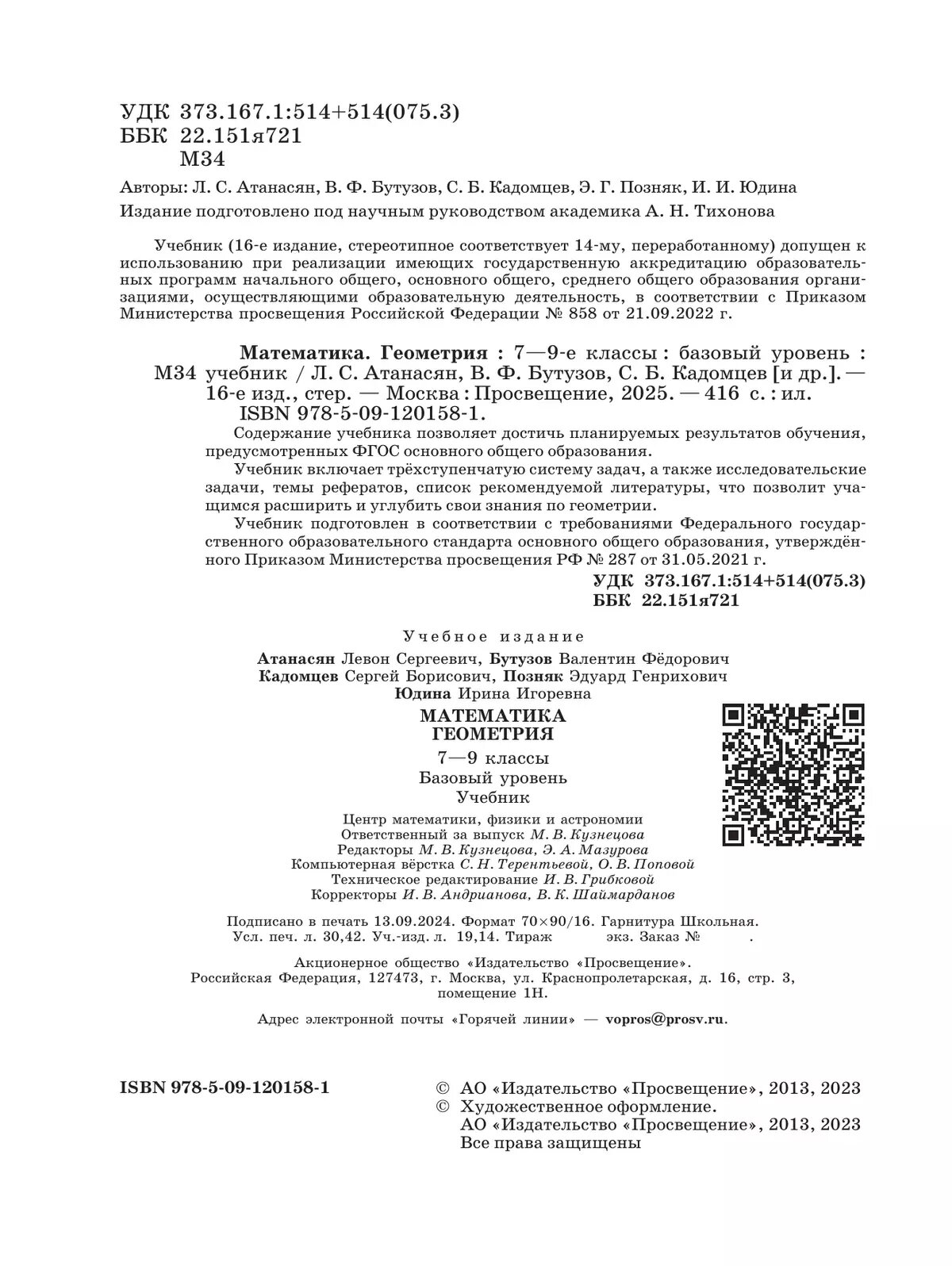Атанасян Геометрия 7-9 классы Учебник являющийся завершённой предметной линии учебников по геометрии для учащихся 7 — 9 классов общеобразовательных организаций. Классический практико-ориентированный курс геометрии, подкорректирован с учетом реализации проверенных временем принципов обучения; Максимальное использование принципа наглядности в подаче материала позволяет обеспечить вариативность, дифференцируемость и другие принципы обучения; Дана широкая система задач, позволяющая достигнуть учащимся планируемых результатов как на базовом, так и на углублённом уровнях. В целом первые четыре главы, относящиеся к 7 классу, — это начальные геометрические сведения и геометрия треугольника. Уже в этих четырёх главах большое внимание уделяется практическим приложениям геометрии: провешивание прямых и измерение углов на местности, использование жёсткости треугольника на практике, уголковые отражатели и их применения в различных конструкциях от простейших устройств до космических аппаратов и т. д. Особенностью содержания, относящегося к 8 классу (главы V — VIII), является сравнительно раннее введение понятия площади многоугольника. Это обеспечивает ряд методических преимуществ в построении курса геометрии, в частности, при изложении темы "Подобные треугольники". В целом же в 8 классе классическими геометрическими методами изучаются свойства треугольников и четырёхугольников, выводятся формулы площадей, рассматриваются различные понятия и факты, связанные с окружностью. В 9 классе основное внимание уделяется векторно-координатному и тригонометрическому аппаратам геометрии. При этом векторы и действия над ними вводятся так, как это принято в физике. Тем самым, достигаются две цели: применение векторного аппарата в геометрии и межпредметная связь с курсом физики. Система задач в учебнике является трёхступенчатой.