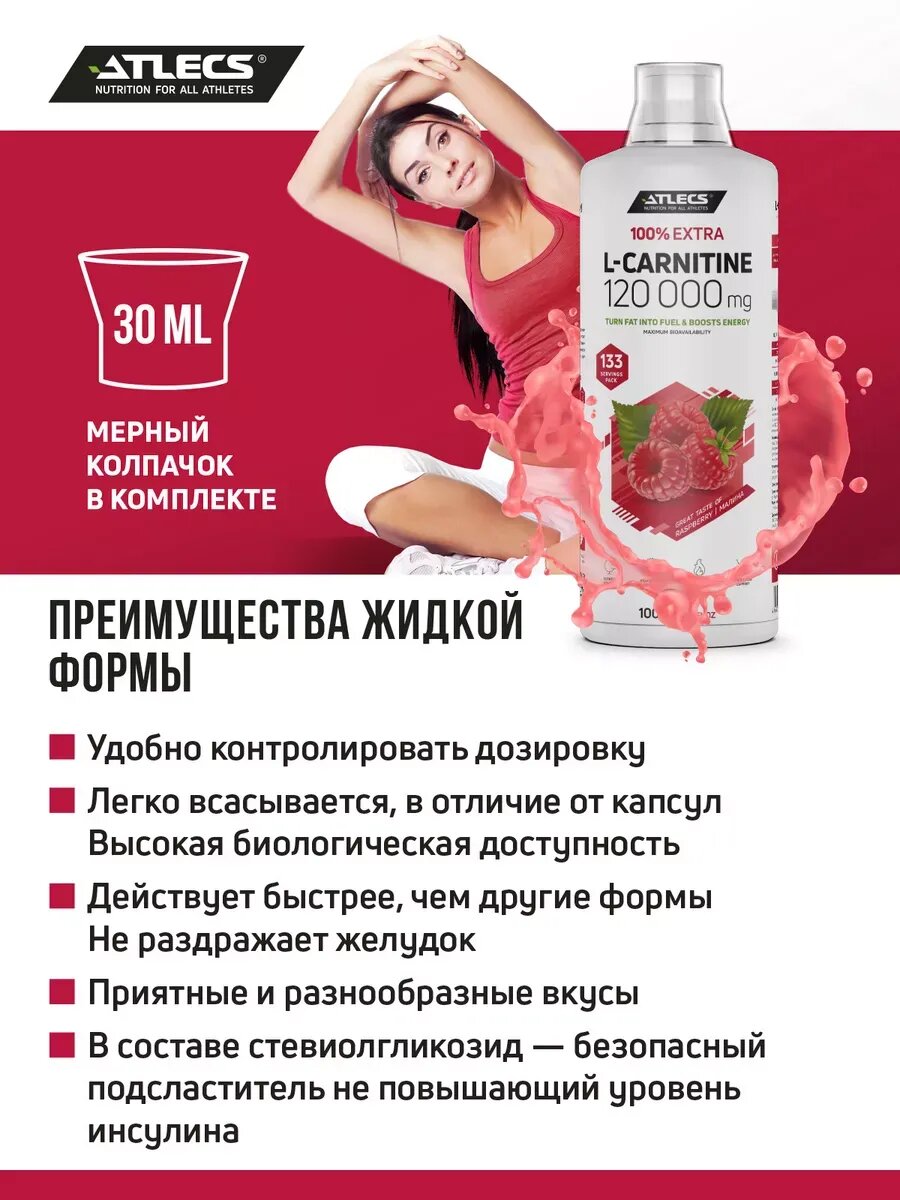 Жидкий 100% L-carnitine, производимый компанией Atlecs, содержит высокую концентрацию действующего вещества на порцию. Карнитин способствует использованию собственных жировых тканей для выработки энергии. Фирма Atlecs в ходе производства применяет качественное сырье без каких-либо примесей, благодаря чему достигается высокая степень чистоты продукта. Сырье немецкой компании Wirud, вода из артезианской скважины, приятный вкус и безопасные подсластители сукралоза и стевия – все это делает Л-карнитин Atlecs 120000 уникальным продуктом, достойным вашего внимания.