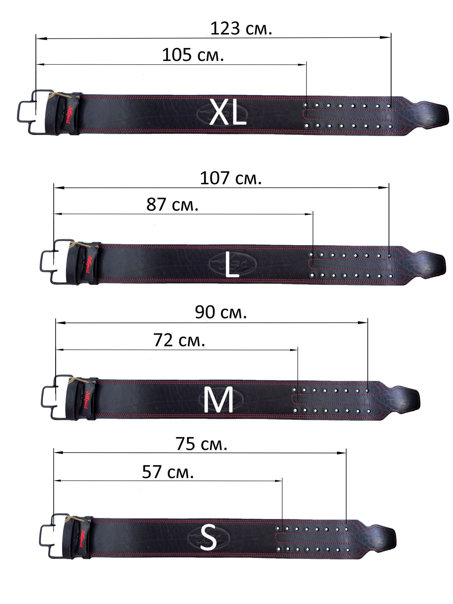 S - min: 57 см, max: 75 см M - min: 72 см, max: 90 см L - min: 87 см, max: 107 см XL - min: 105 см, max: 123 см