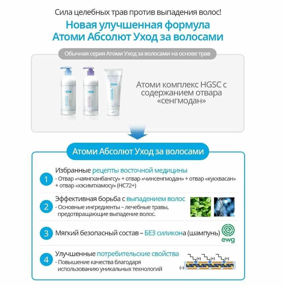 - Шампунь Атоми Абсолют 500 мл (Atomy Absolute Shampoo) - содержит салицилловую кислоту, бережно и качественно очищает волосы, пантенол питает и успокаивает кожу головы, ментол освежает. Нанести средство на влажные волосы массирующими движениями взбить в пену и тщательно смыть водой.