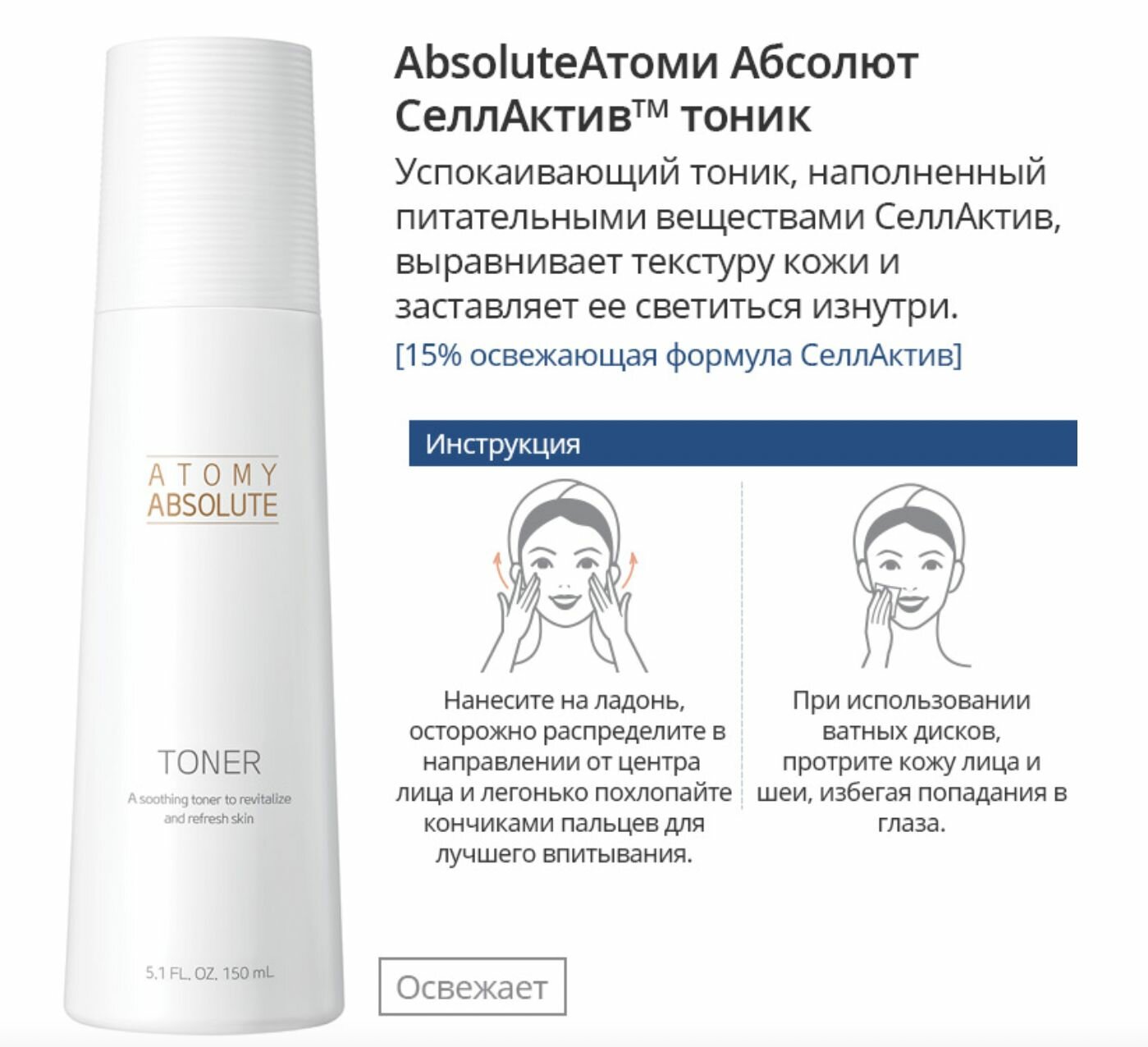 | Способ применения | нанесите необходимое количество сыворотки Абсолют СеллАктив на тыльную часть вашей руки или ладони. Когда сыворотка уже практически впиталась осторожно похлопайте лицо кончиками пальцев |