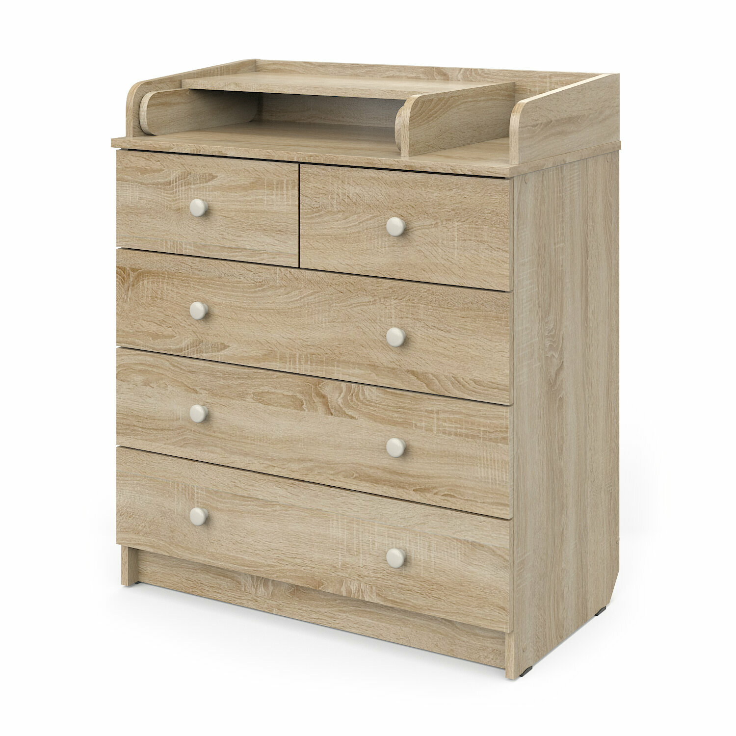 Комод Атон «Сириус-2» ЛДСП - удобный и практичный комод с пеленальным столиком – незаменимый предмет для детской комнаты. Пеленальный столик с откидной крышкой не только помогает маме в переодевании ребенка, но при этом экономит пространство в помещении за счет удобного механизма складывания. 5 вместительных ящиков с лёгкостью выдвигаются и задвигаются на шариковых направляющих. На столешнице предусмотрено специальное место для предметов первой необходимости, чтобы было все под рукой В дальнейшем пеленальный столик можно использовать в качестве дополнительной полочки под аксессуары, или полностью его демонтировать, продолжив использовать комод в его классическом виде. Характеристики: 5 функциональных ящиков на шариковых направляющих шариковые направляющие выдерживают внушительный вес и обеспечивают легкое движение ящиков откидной столик с надежным креплением и оградительными бортиками с трех сторон специальное место для мелочей на столешнице спил под плинтус гладкое покрытие имитирует текстурный рисунок натуральной древесины идеально обработанные кромки скругленные углы фирменная фурнитура используемый в производстве комода, материал, не токсичен Материалы: ЛДСП Размер (ВхШхГ): 97,5 х 79,6 х 46,8 см Вес: 43 кг