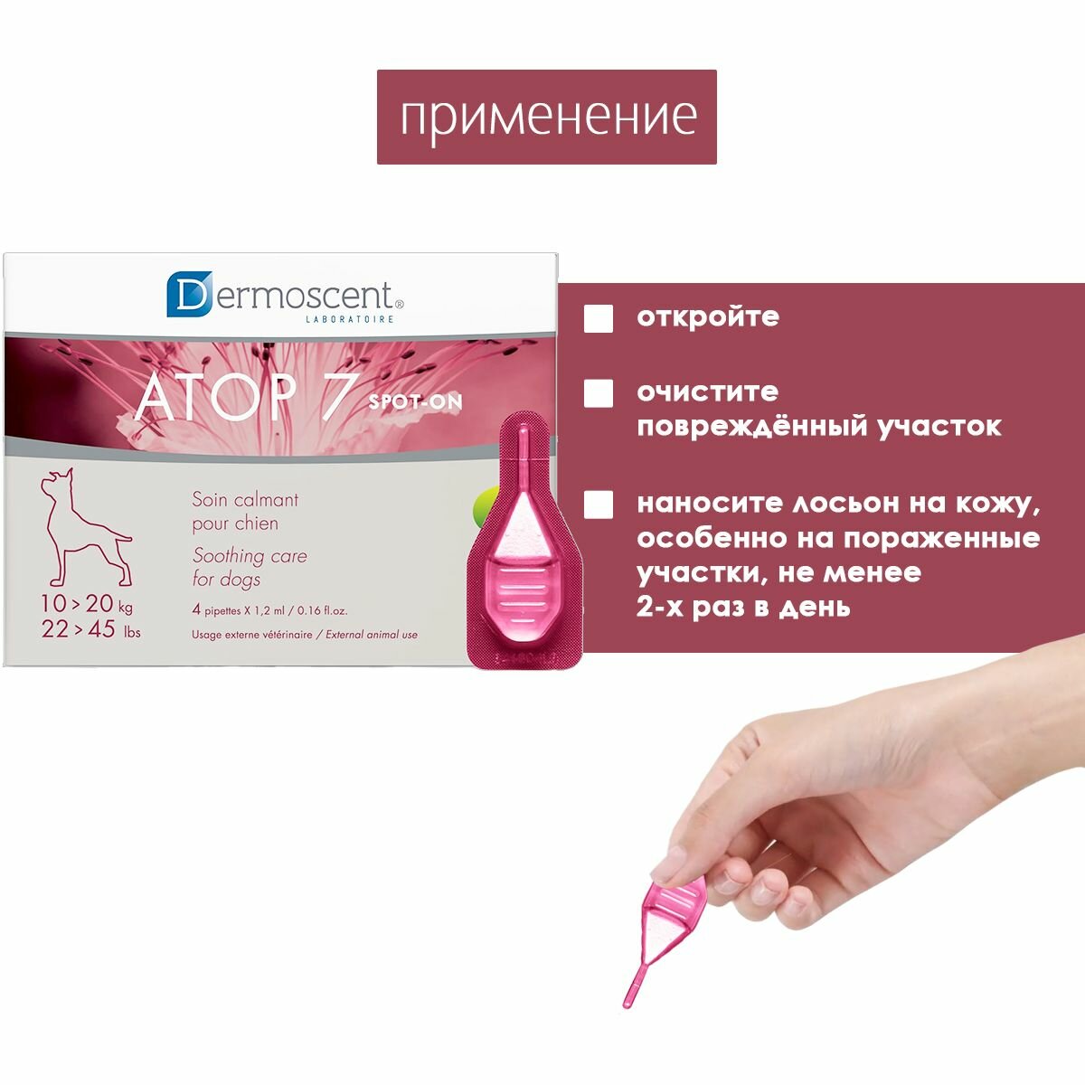 Дермосцент атоп 7 Спот-он подходит для использования в качестве дополнения к медикаментозному лечению или в периоды между обострениями для поддержания здоровья кожи вашего питомца.