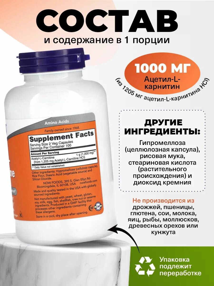 Ацетил-L-карнитин (ALC) — это модифицированная аминокислота, которая поддерживает выработку клеточной энергии, помогая транспортировать жир в митохондрии, где он превращается в АТФ (топливо для клеток). Ацетил-L-карнитин — это форма карнитина с высокой биодоступностью, которая может преодолевать гематоэнцефалический барьер. Он помогает нейтрализовать свободные радикалы, поддерживает функцию митохондрий и нормальную активность нейромедиаторов. Клинические исследования показывают, что ацетил-L-карнитин помогает поддерживать здоровье нервной системы. замедляет процесс старения клеток головного мозга и улучшает его функционирование; повышает концентрацию внимания и работоспособность; активирует сжигание жира и ускоряет обмен веществ; обеспечивает приток дополнительной энергии, повышает работоспособность; способствует наращиванию мышечной массы; помогает улучшить физические показатели, нормализовать белковый и жировой обмен при беге, ходьбе и других кардионагрузках; укрепляет иммунитет и ускоряет реабилитацию после болезней; снижает уровень холестерина в крови и улучшает работу сердца. Рекомендации по применению: Принимать по 1–2 капсулы 1–2 раза в день по мере необходимости. Противопоказания: Индивидуальная непереносимость компонентов. Если вы беременны, кормите грудью, принимаете какие-либо лекарства или страдаете каким-либо заболеванием, проконсультируйтесь с врачом, прежде чем принимать какие-либо пищевые добавки. Предупреждения: Хранить в недоступном для детей месте. Не следует превышать рекомендуемую дозировку. Не является лекарственным средством. Комплектация: 1 банка, 200 капсул. Производитель оставляет за собой право изменить внешний вид упаковки, состав продукта, вкусовые добавки и его консистенцию. Мы стараемся следить за изменениями, но, если вы заметили какое-либо несоответствие, пожалуйста, сообщите нам об этом в разделе "вопросы о товаре". Благодарим!
