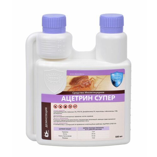 Средство инсектицидное Ацетрин Супер КЭ - это концентрат эмульсии в виде густой жидкости темно-желтого до светло-коричневого цвета. Содержит в качестве действующего вещества (ДВ) ацетамиприд (10%) из группы неоникотиноидов и перитроид эсбиотрин (5%). В состав данного средства также входят синергисты ППБ (5%) и MGK 264 (дикарбоксимид)(5%), различные эмульгаторы, стабилизаторы, ПАВ и растворитель.Средство обладает высоким острым инсектицидным действием в отношении тараканов и клопов и остаточным действием в зависимости от вида насекомого, его численности и типа обрабатываемой поверхности.