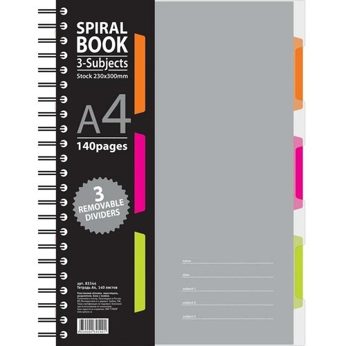 Бизнес-тетрадь Attache Selection Spiral Book формата А4, размер 230×298 мм. Обложка с вырубкой выполнена из жесткого экологичного прозрачного пластика серого цвета с волнистым рельефом. Двойная толстая евроспираль увеличенного диаметра. Внутренний блок из белой офсетной бумаги плотностью 70 г/кв. м. Размер блока — 205×297 мм. Бизнес-тетрадь содержит пластиковые съемные разделители. Первый лист из плотной бумаги с запечаткой, разлиновка в клетку с аккуратными полями.