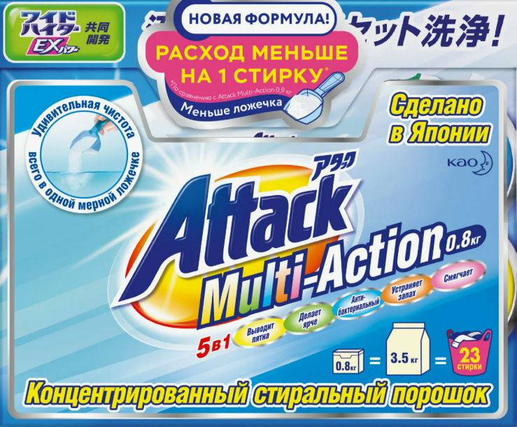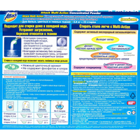 Набор Attack, Multi-Action стиральный порошок с кислородным пятновыводителем и кондиционером, 0,8 кг - 8штAttack Multi-Action 800 гр. – это японский концентрированный стиральный порошок, специально разработанный для автоматических стиральных машин, который подходит для стирки белого, цветного и детского белья. Благодаря своей уникальной формуле, порошок эффективно удаляет даже самые сложные загрязнения, сохраняя при этом яркость цветов и структуру ткани. Белье после стирки становится не только чистым и свежим, но и приобретает антибактериальную защиту, что особенно важно для детского гардероба. Использование высококачественных компонентов делает порошок безопасным и экологически чистым, что подтверждает его принадлежность к сегменту ЭКО-продукции. Attack Multi-Action не содержит агрессивных химических веществ, что гарантирует бережное отношение к деликатным тканям и чувствительной коже. Кроме того, компактная упаковка 800 граммов экономит место и позволяет использовать порошок длительное время благодаря его высокой концентрации. Японский порошок Attack уже завоевал признание потребителей по всему миру за свою эффективность и безопасность, делая его идеальным выбором для всей семьи. Гибкая система оплаты и быстрая доставка нашего интернет магазина бытовой химии позволяет купить Набор Attack, Multi-Action стиральный порошок с кислородным пятновыводителем и кондиционером, 0,8 кг - 8шт в Москве потратив всего несколько минут времени.