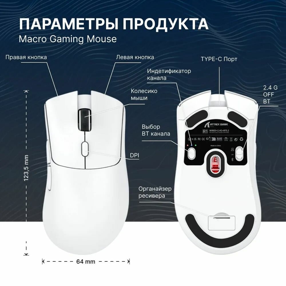 | Комплектация | Коробка производителя - 1 шт., мышь игровая R1 - 1 шт., беспроводной приемник 2.4 G - 1шт., кабель для зарядкисоединения USB-Type-C - 1 шт., грипсы противоскользящие - 4 шт., инструкция - 1 шт. |