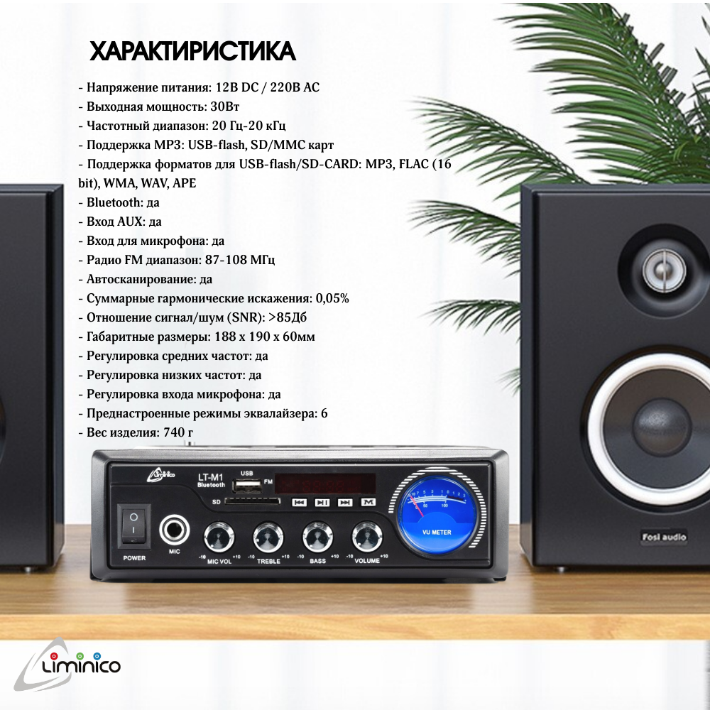 Аудио Bluetooth усилитель Liminico LT-M1 2-канальный 15 Вт + 15 Вт предназначен для усиления мощности звука для колонок, ноутбука и любой домашней акустики. Усилитель имеет регулировку звука, максимальная частота звучания 20 Гц. Приемник в обязательном порядке оборудован цап (цифро аналоговым преобразователем). В смартфонах, ноутбуке или на CD звук хранится в цифровом виде, но акустическая система и наушники воспроизводят аналоговый сигнал, воспринимаемый нашим слухом. Домашний аудио усилитель имеет плату блютуз для беспроводного подключения и использования в компьютере, ноутбуке, стереосистеме и других устройствах. Усилители этой модели могут работать как от сети 220 В, так и через адаптер на 12 В (адаптер в комплект не входит). Двухканальный цифровой усилок с bluetooth обеспечивает хороший звук на низких и высоких частотах, его усиление и общее удобство использования.