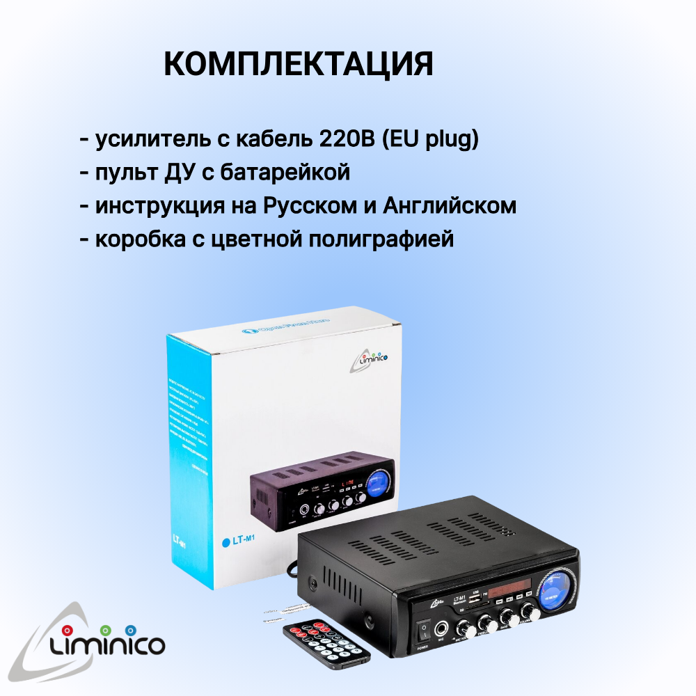 Аудио Bluetooth усилитель Liminico LT-M1 отлично воспроизводит звучание через сабвуфер (на самых низких частотах от 20 до 65 Гц). Аудиотехника легко управляется кнопками и поворотными регуляторами, мощности усилителя достаточно для качественного громкого звучания при подключении дома или в автомобиле. Двухканальный усилитель на домашнем ПК оборудован FM радио. Цифровой усилитель отлично подойдет как для динамиков, так и для микрофона. Воспроизведение через hi-fi музыки и речи будет с насыщенным, объемным и глубоким звучанием. Модель усилителя актуальна и под аудиоплеер, позволяя насладиться качественным звуком, отлично подойдет для колонки. Цифровой прибор хорошо передает звучание на динамики. С помощью усилителя удобно прослушивать любой музыкальный канал через динамики. Устройство востребовано для дома, качественная акустика и быстрое подключение к bluetooth гарантирует пользователям длительное наслаждение объемным звучанием.