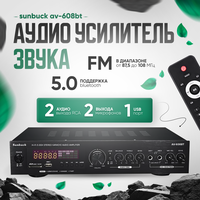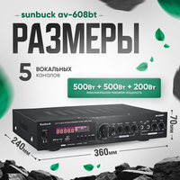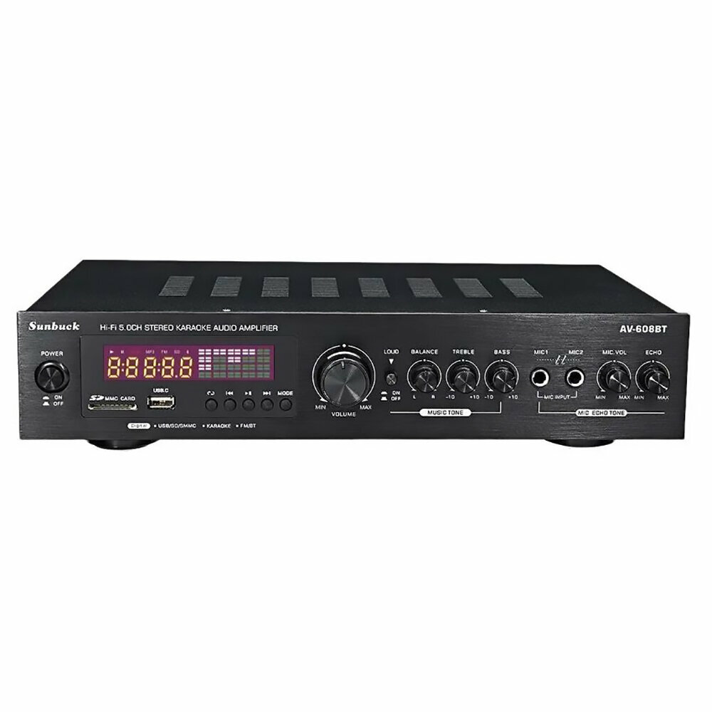 Аудио усилитель звука Sunbuck AV-608BT Bluetooth – пятиканальное звуковое устройство с высокими характеристиками. Для колонок предусмотрено несколько выходов, а именно: два по 150 Вт, два по 50 Вт и один на 25 Вт. Поскольку усилитель имеет встроенный ЦАП, он может самостоятельно воспроизводить музыку и другие аудиозаписи с цифровых носителей или получаемые через цифровой интерфейс. Для управления воспроизведением домашний плеер имеет органы управления на передней панели (пуск, стоп, следующий и предыдущий трек). Для воспроизведения аудио прибор с блютуз не во всех случаях требует соединения с источниками проводным способом. Беспроводные соединения позволяют значительно упростить коммутацию, избавиться от нагромождения проводов в комнате. Сравнение модели с другими предложениями в категории «Домашние усилители» показывает, то этот усилок выделяется своими плюсами. На сегодня нормой в названной категории является наличие bluetooth, соответствие уровню hi fi и стерео звучание. Sunbuck AV 608BT отвечает этим требованиям, но предоставляет в распоряжение пользователя 5 каналов для динамиков, выходы для наушников, удобную возможность подключить сабвуфер. Эта аудиотехника также превосходит конкурентов по мощности, приведенные выше номинальные показатели для динамиков в пиковом режиме у модели также в разы больше – 500, 500 Вт и 200 Вт. Для микрофона в усилителе предусмотрен один регулятор уровня громкости и два гнезда подключения. Соответствие стандартам hi-fi гарантирует воспроизведение и усиление музыки без искажений относительно оригинала, при этом по желанию пользователя аудиоплеер для колонки может самостоятельно накладывать эффект эхо (реверберация) с регулируемой задержкой звука. Как аналоговый, так и цифровой тракт усилителя с выходом на динамики имеет характеристики высокого уровня – отношение сигнал/шум выше 90 дБ, коэффициент нелинейных искажений до 0,5%, во всем слышимом человеческим ухом звуковом диапазоне неравномерность АЧХ не превышает 10 дБ. Также нужно отметить удобство органов управления усилителя, у которого эргономичные поворотные регуляторы и кнопки собраны на передней панели в функциональные группы. Созданный с помощью AV 608BT музыкальный центр или студия для дома отличается надежной работой, при этом акустика отвечает профессиональному уровню при относительно невысокой цене оборудования.